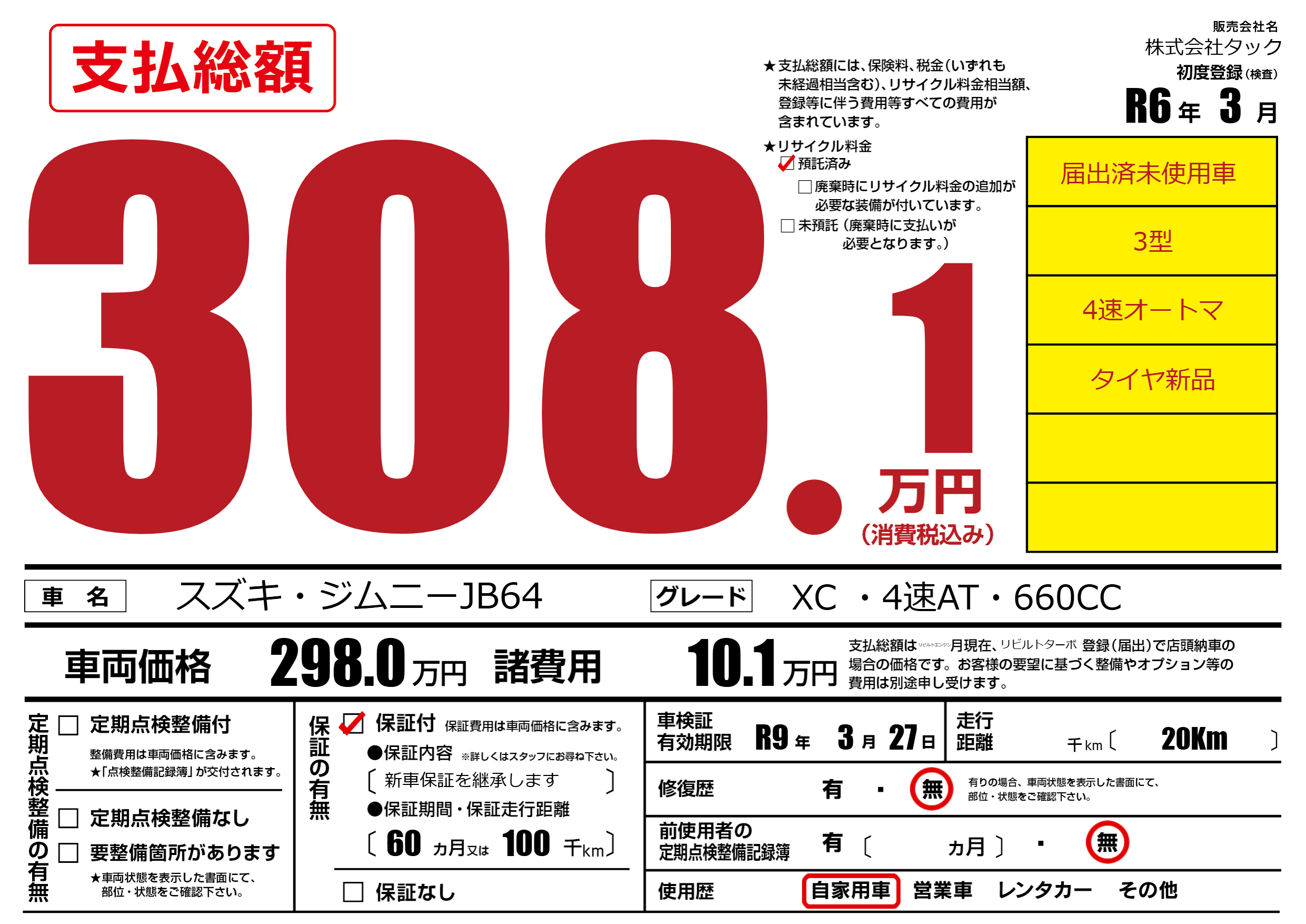 | 車名 | スズキ・ジムニーJB64 | グレード ミッション 排気量 |