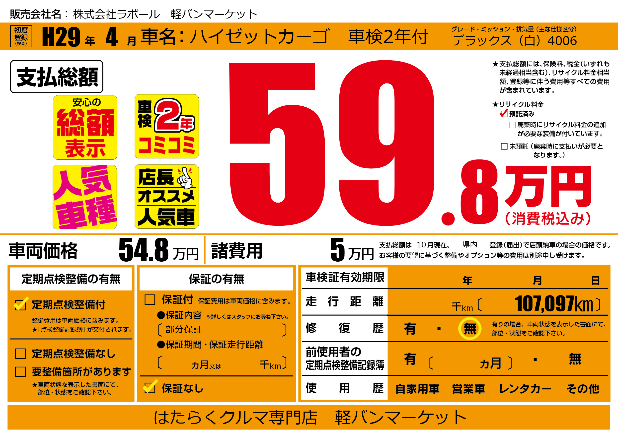 | 車名 | ハイゼットカーゴ 車検2年付 | グレード ミッション 排気量 |
