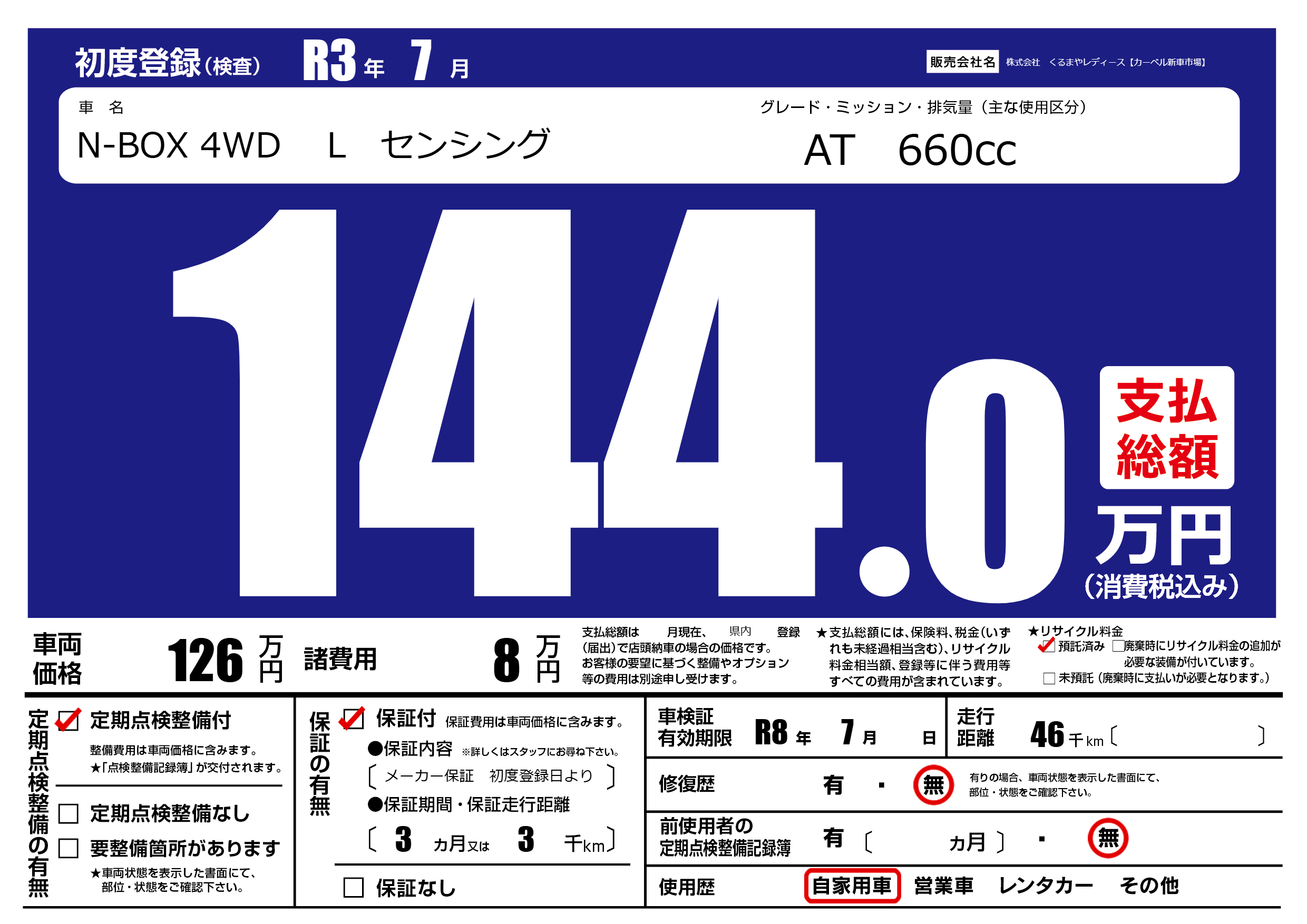 | 車名 | N-BOX 4WD L センシング | グレード ミッション 排気量 |