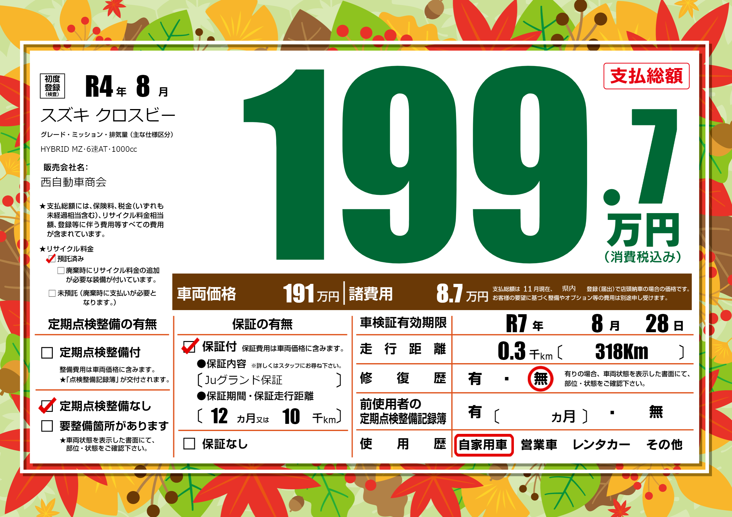 | 車名 | スズキ クロスビー | グレード ミッション 排気量 |