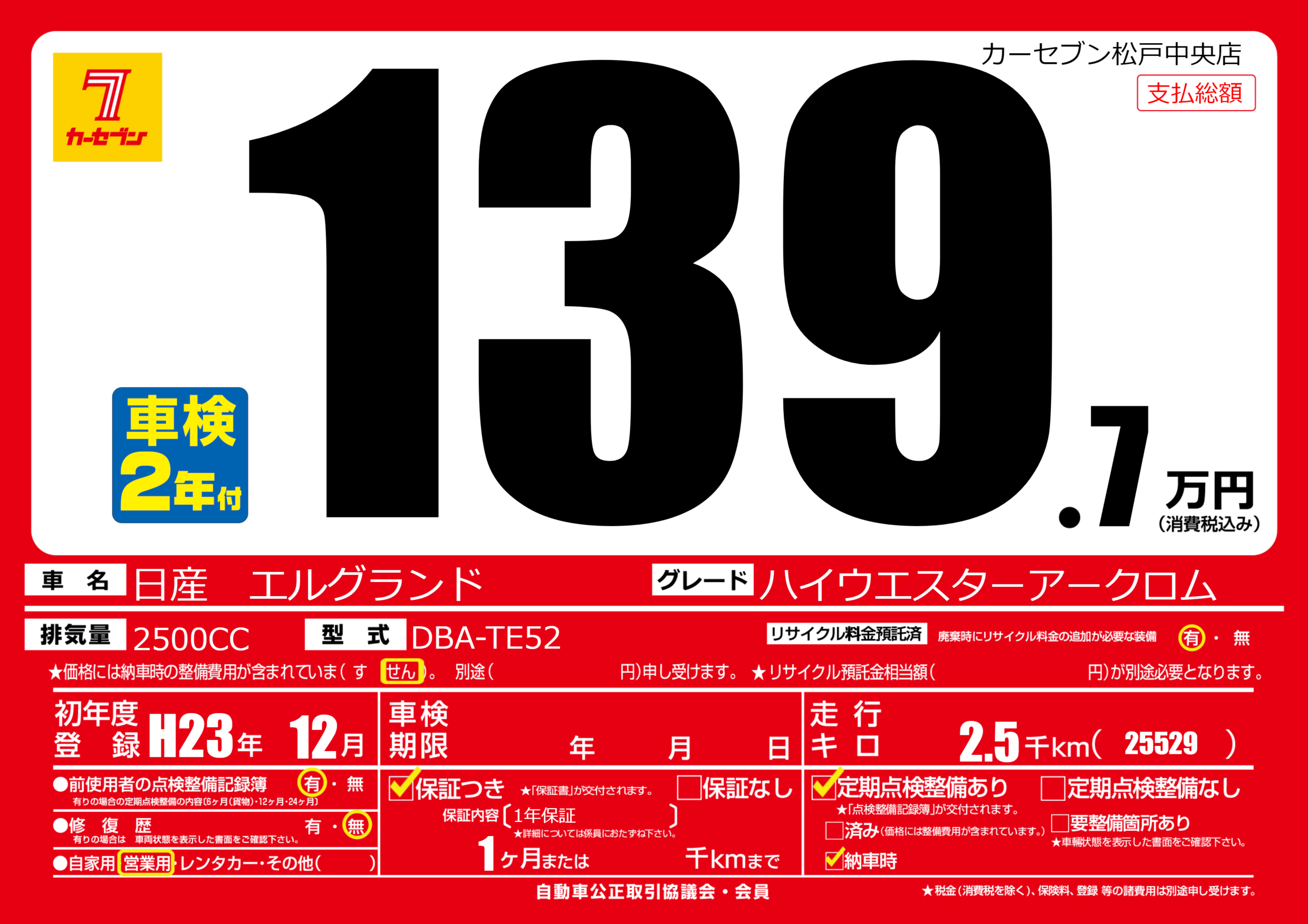 | 走行キロ | 0.2万km | 初年度登録 | H23年12月 |