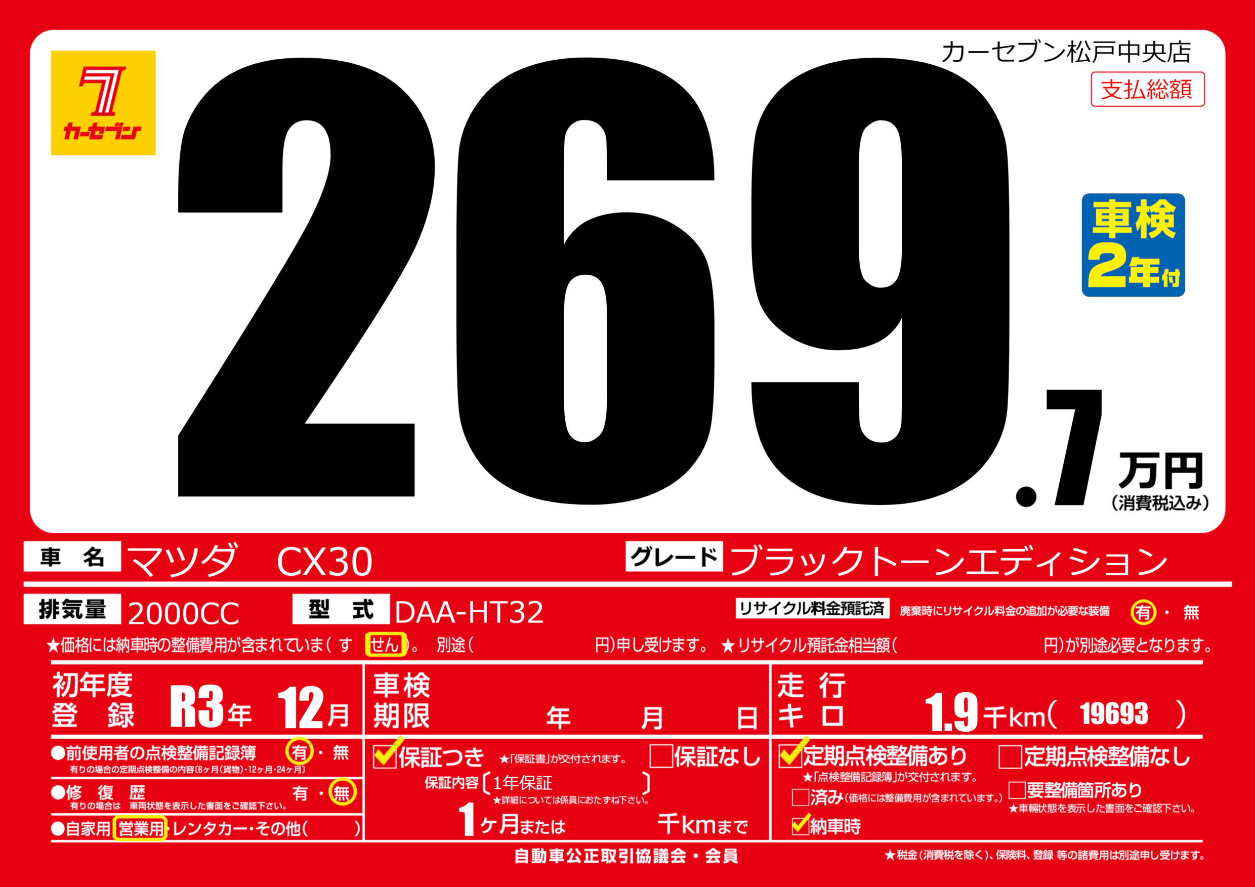 | 車名 | マツダ CX30 | グレード ミッション 排気量 |