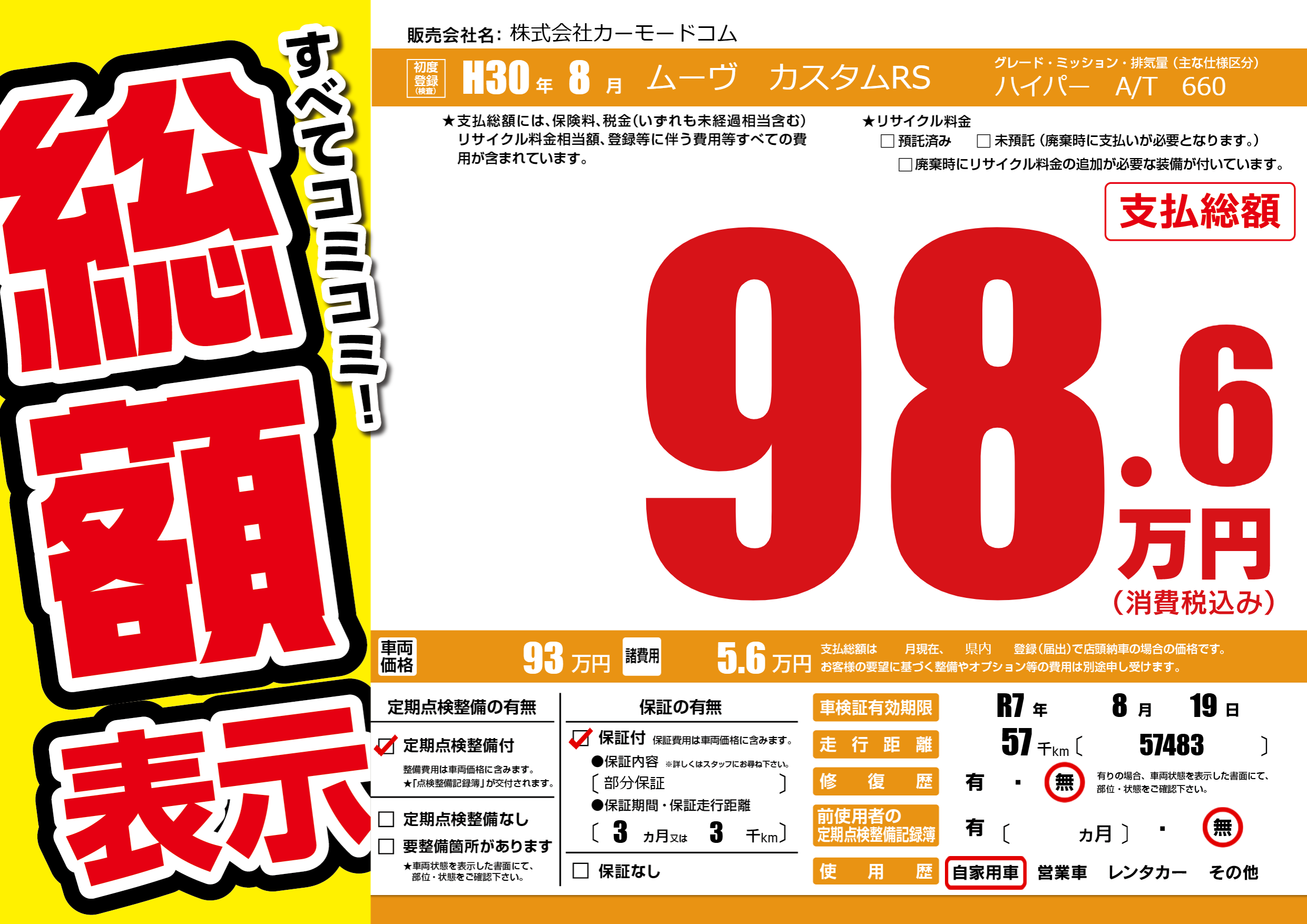 | 走行キロ | 5.7万km | 初年度登録 | H30年8月 |