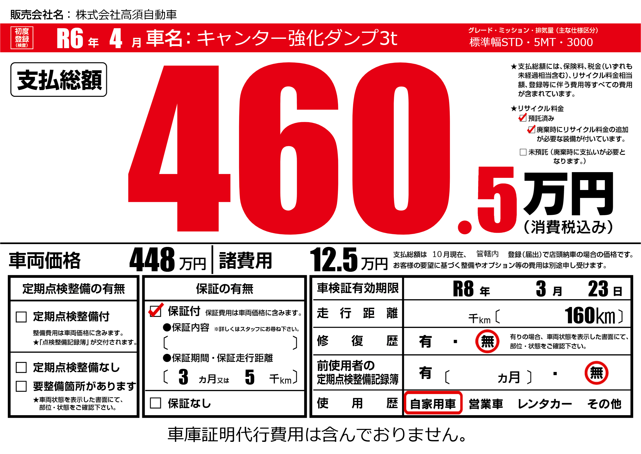 | 車名 | キャンター強化ダンプ3t | グレード ミッション 排気量 |