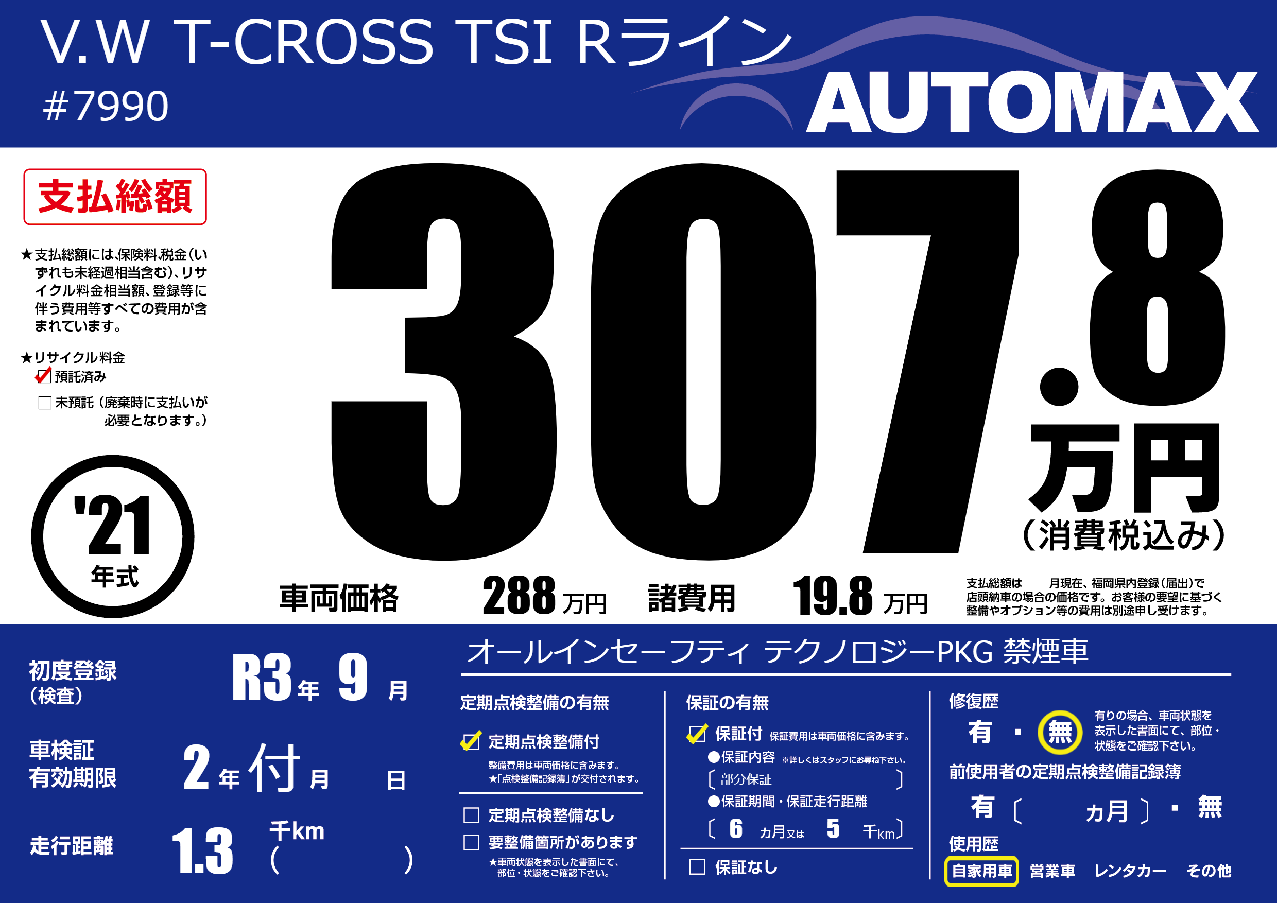 | 車名 | V.W T-CROSS TSI Rライン | グレード ミッション 排気量 |