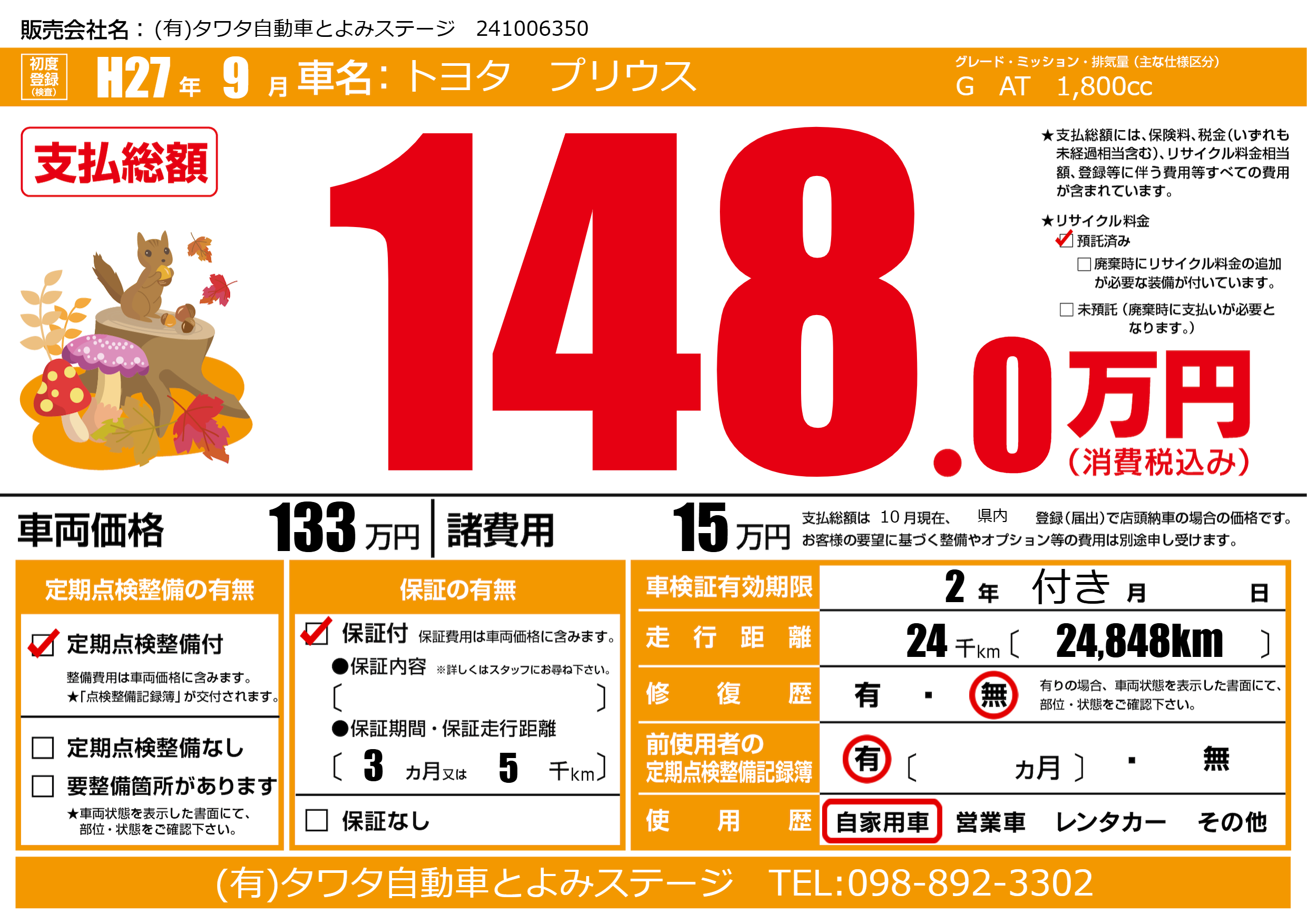 | 車名 | トヨタ プリウス | グレード ミッション 排気量 |