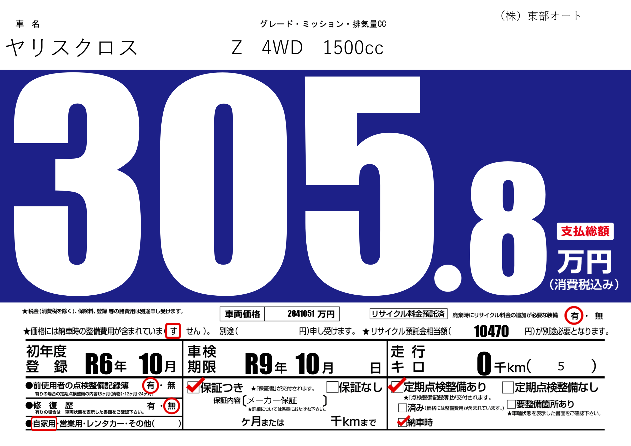 | 車検制限 | R9年 10月 - 日 | ||