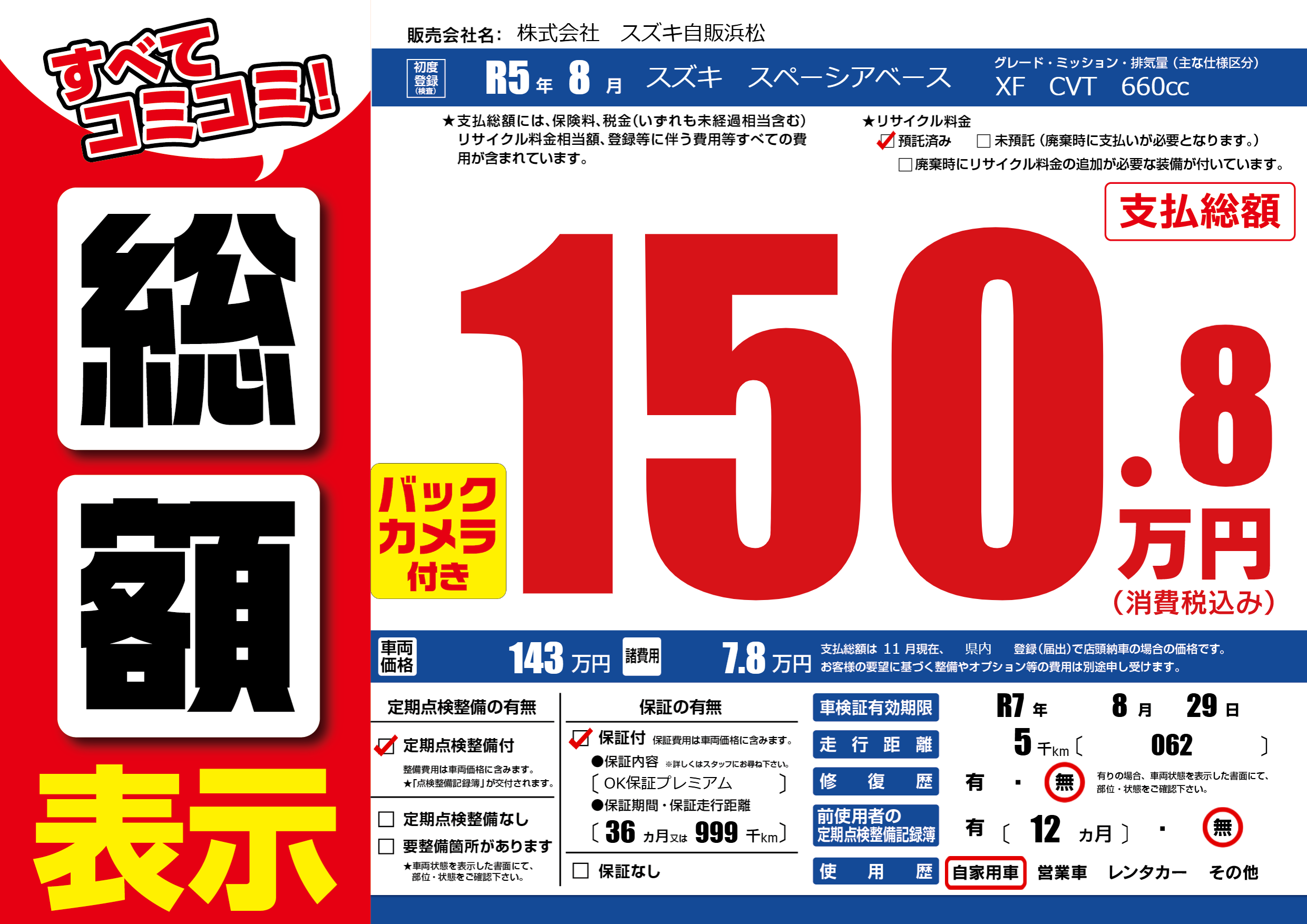 | 車名 | スズキ スペーシアベース | グレード ミッション 排気量 |