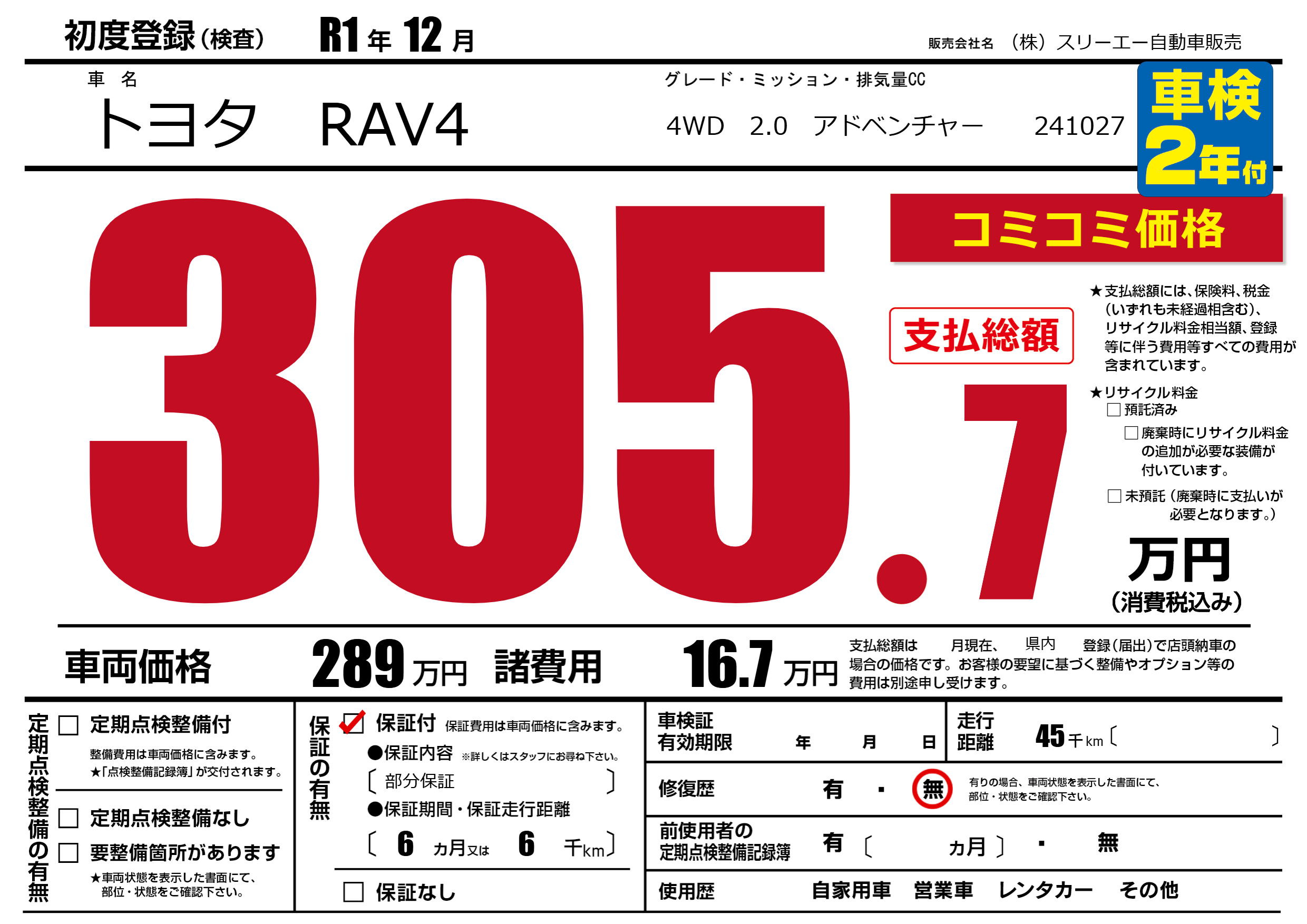 | 車名 | トヨタ RAV4 | グレード ミッション 排気量 |