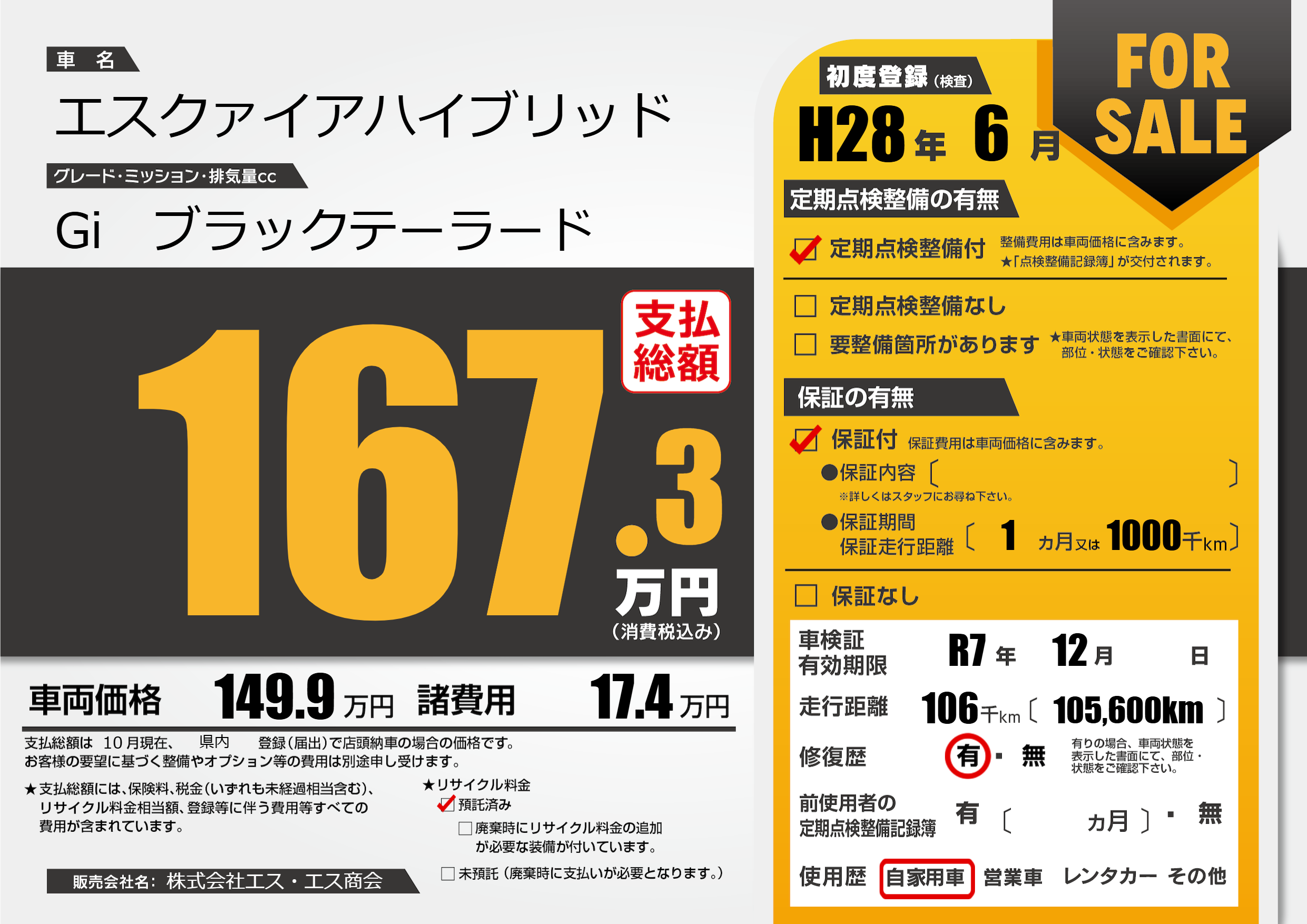 | 走行キロ | 10.6万km | 初年度登録 | H28年6月 |