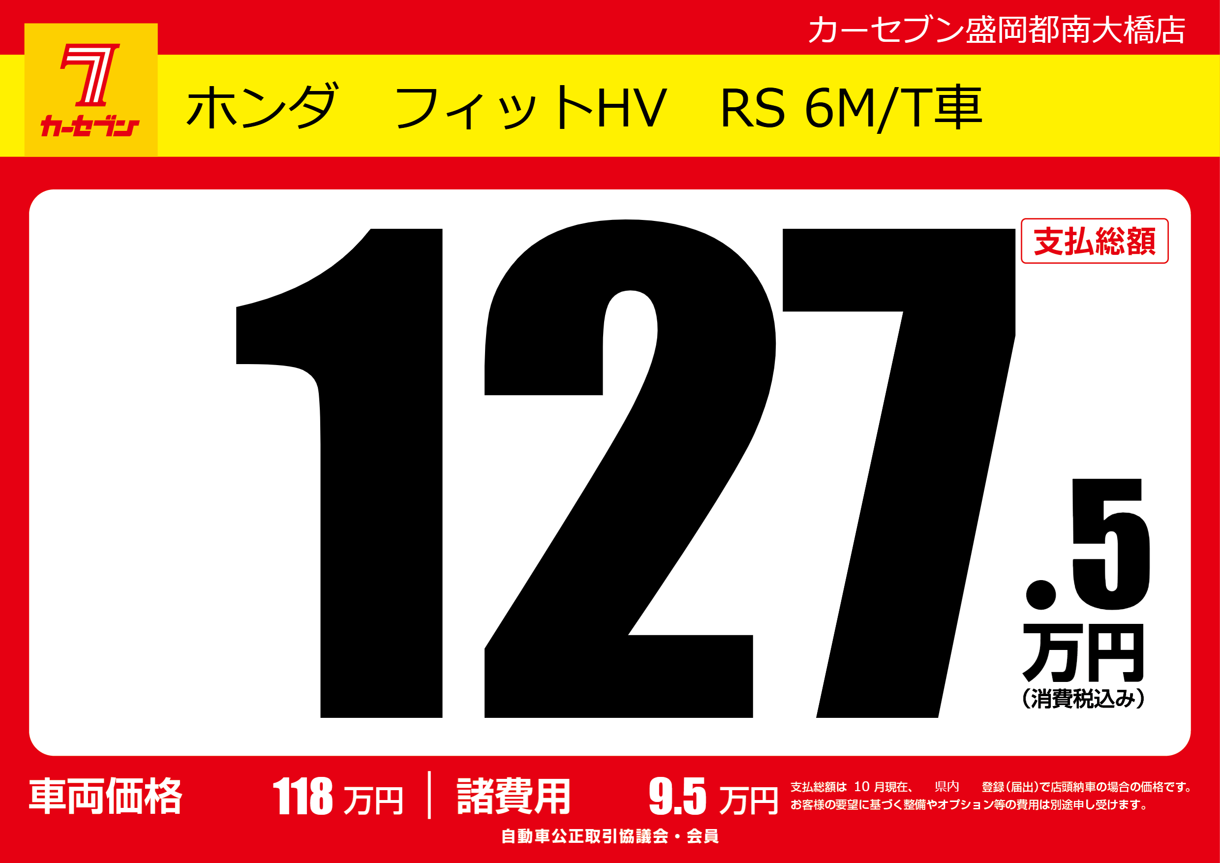 | 車名 | ホンダ フィットHV RS 6M/T車 | グレード ミッション 排気量 |