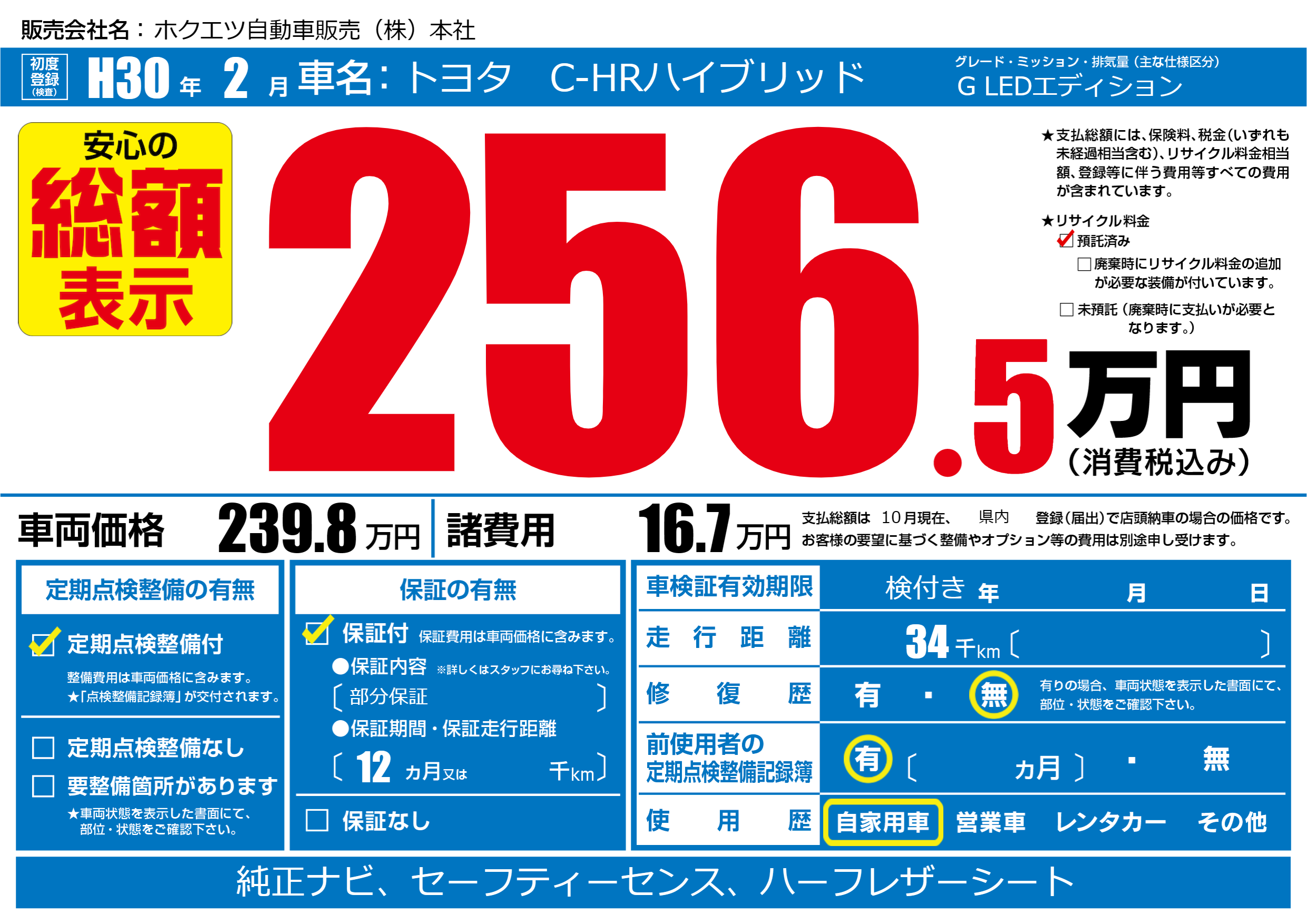 | 車名 | トヨタ C-HRハイブリッド | グレード ミッション 排気量 |