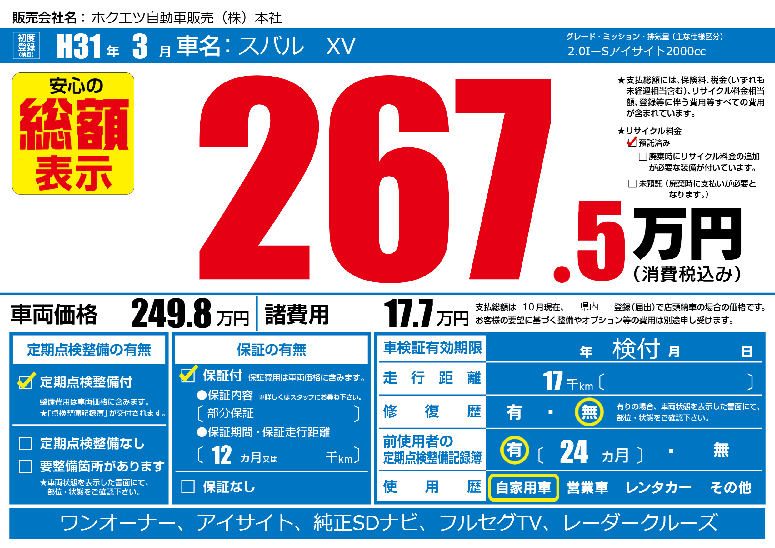 | 車名 | スバル XV | グレード ミッション 排気量 |