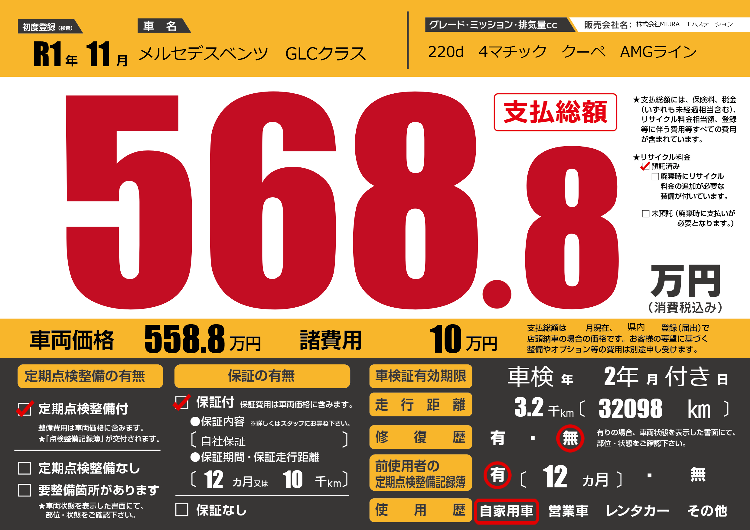 | 車名 | メルセデスベンツ GLCクラス | グレード ミッション 排気量 |
