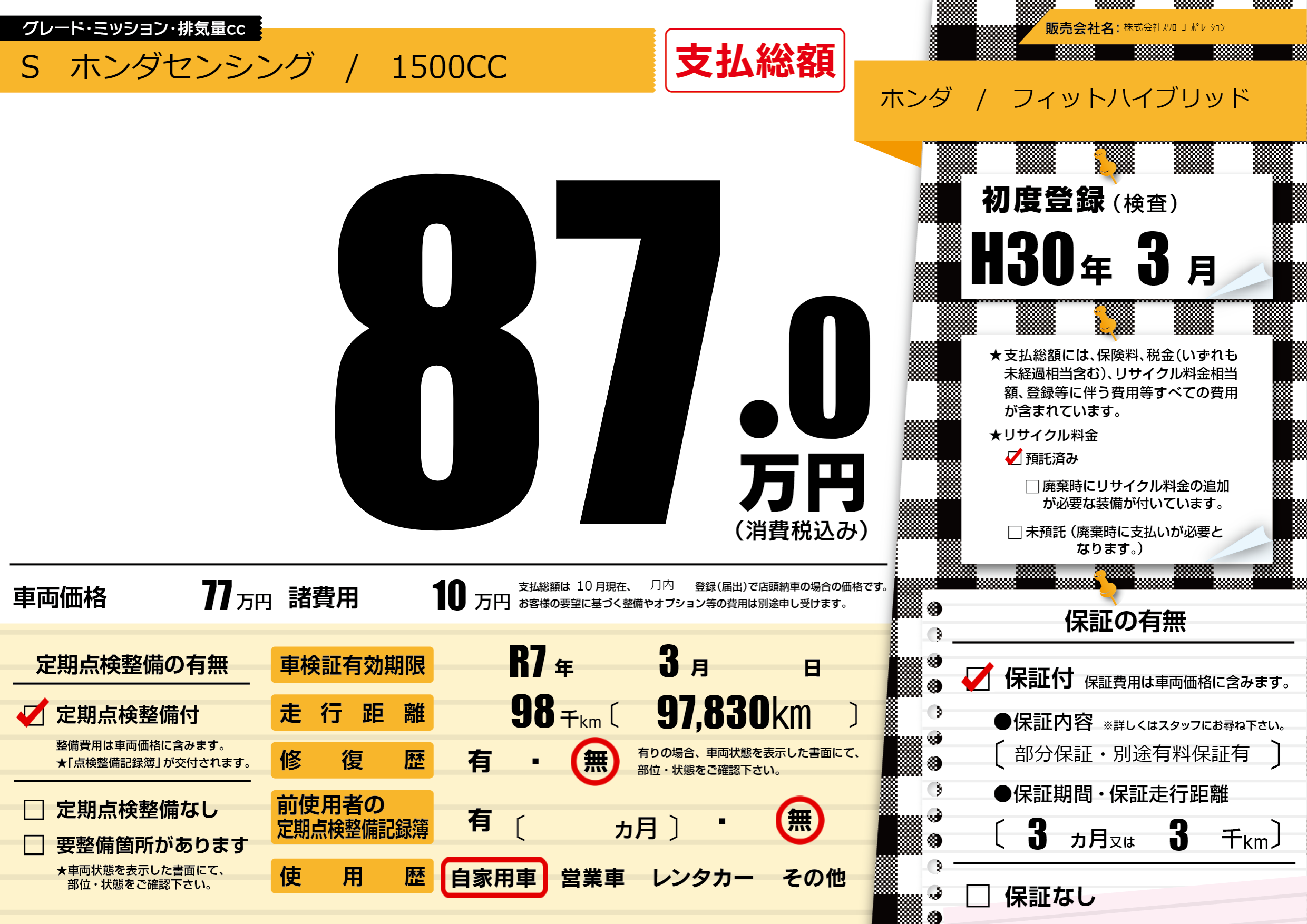 保証付き 保証内容(部分保証・別途有料保証有) 3ヶ月または(3)千kmまで |