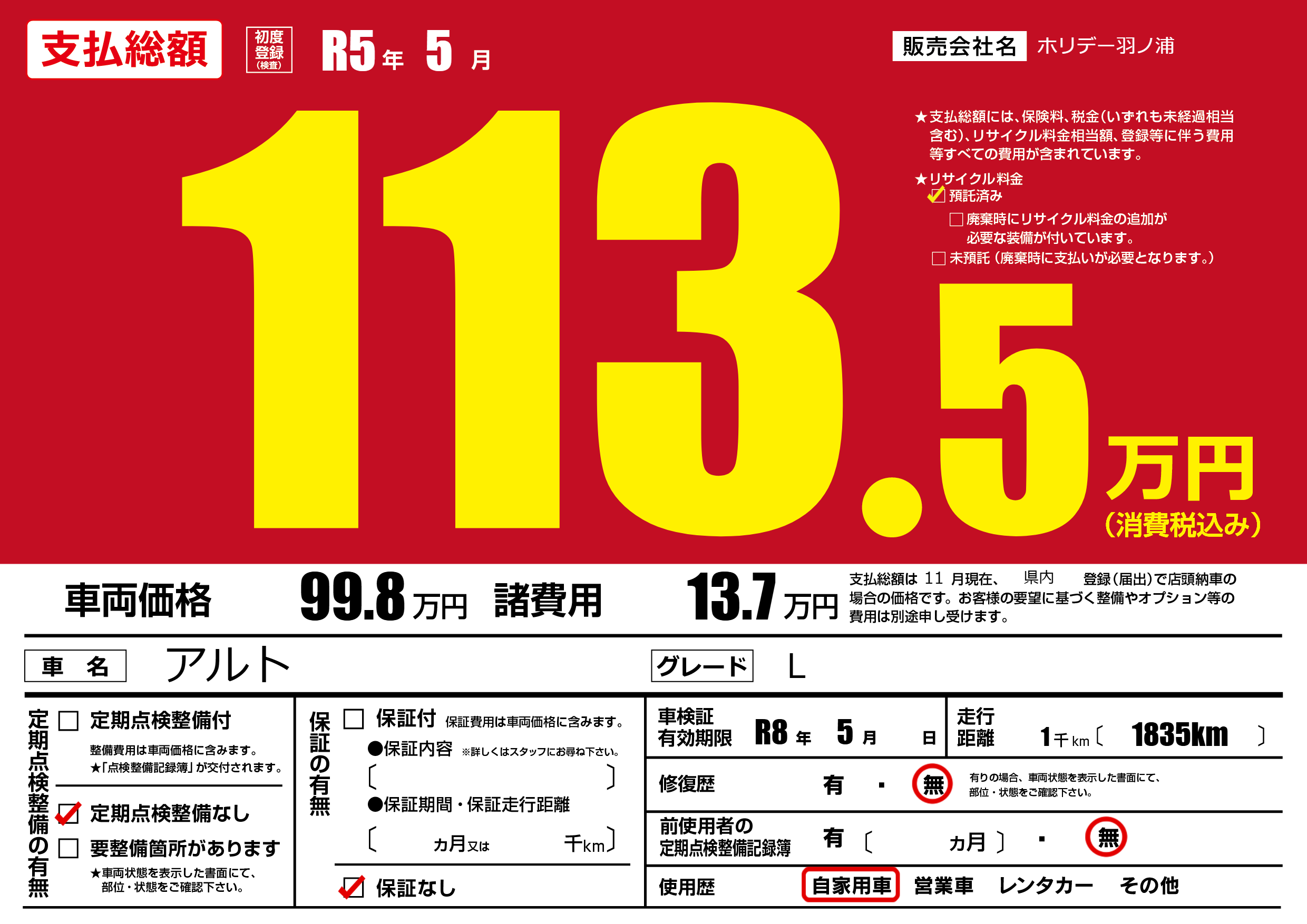 | 走行キロ | 0.1万km | 初年度登録 | R5年5月 |