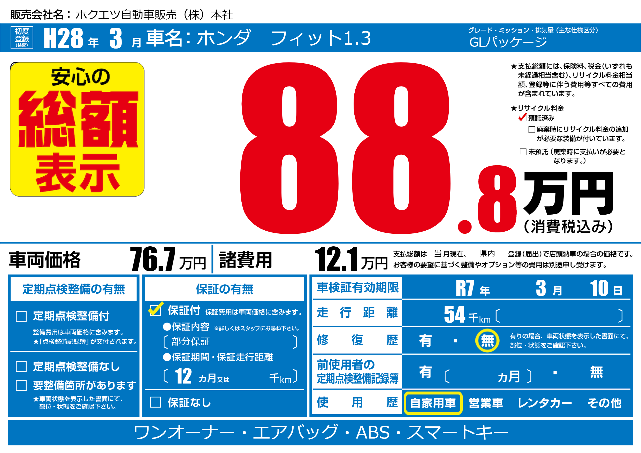 | 車名 | ホンダ フィット1.3 | グレード ミッション 排気量 |