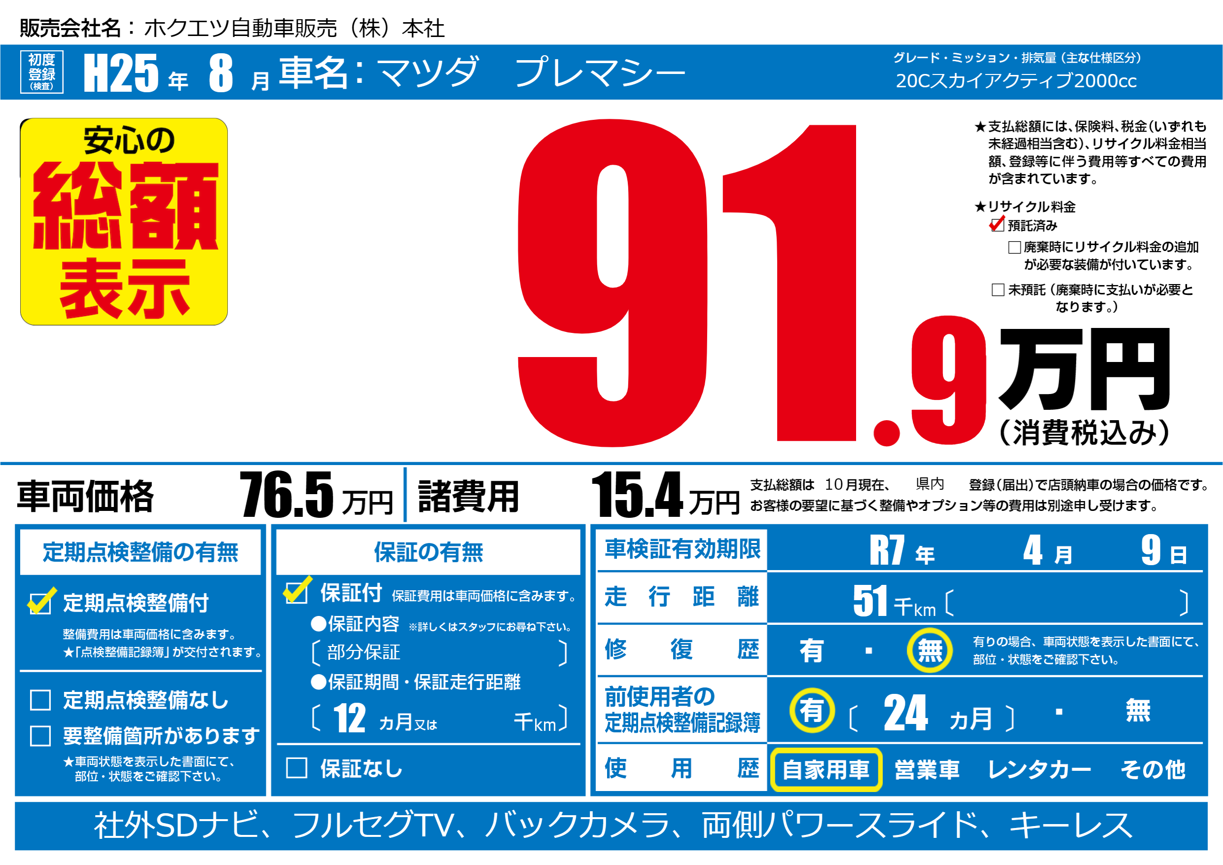 | 車名 | マツダ プレマシー | グレード ミッション 排気量 |