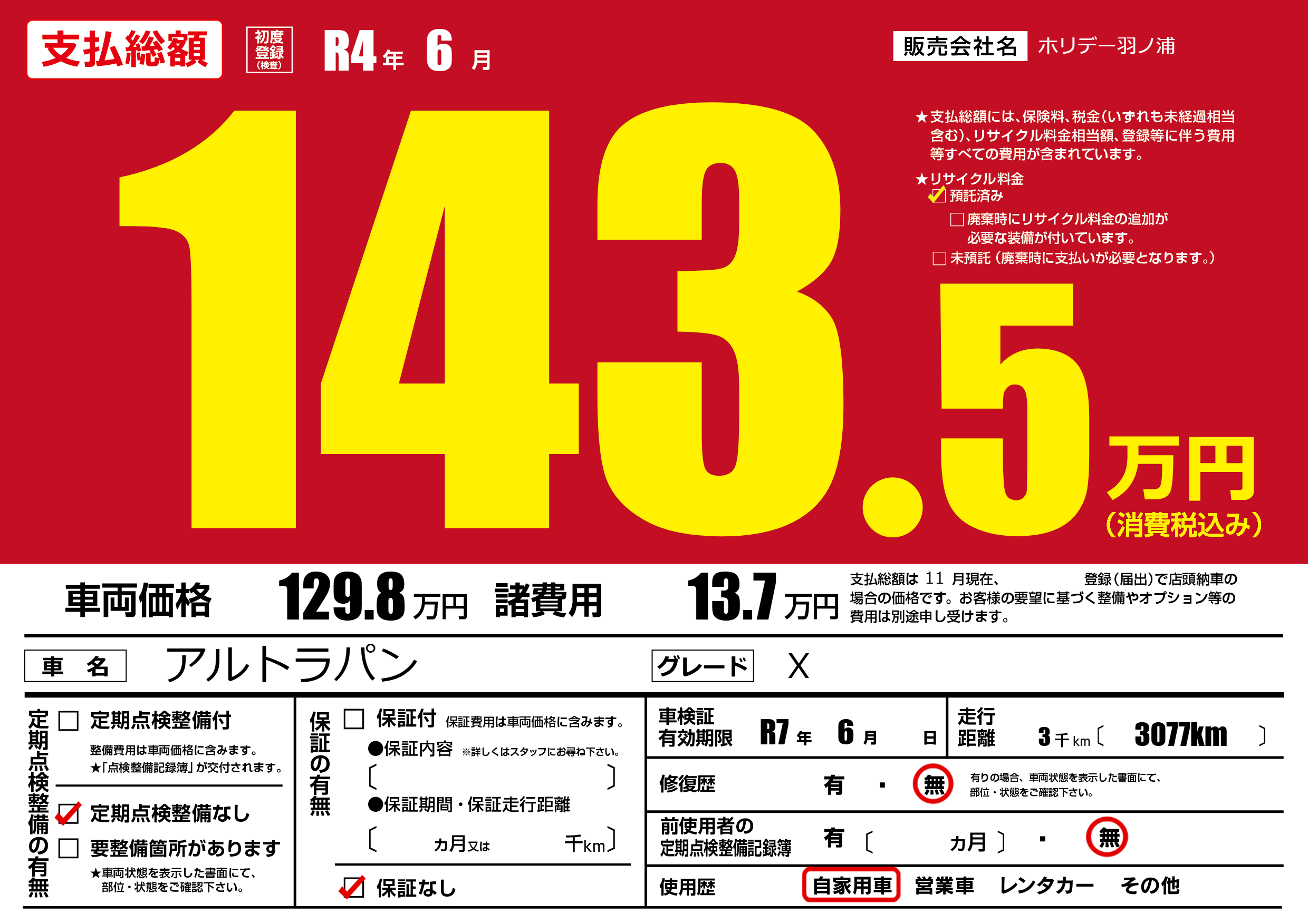 | 走行キロ | 0.3万km | 初年度登録 | R4年6月 |