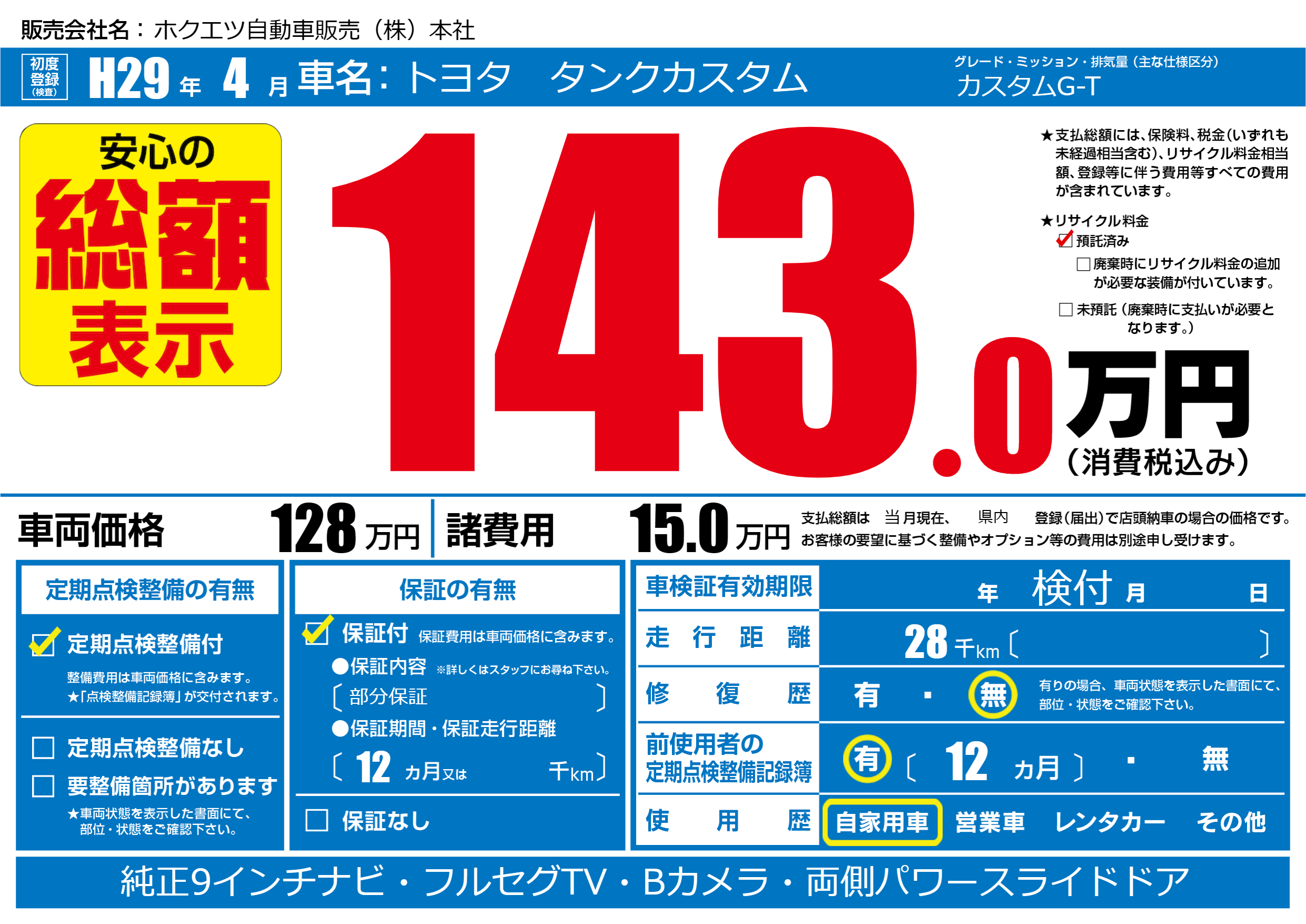 | 走行キロ | 2.8万km | 初年度登録 | H29年4月 |