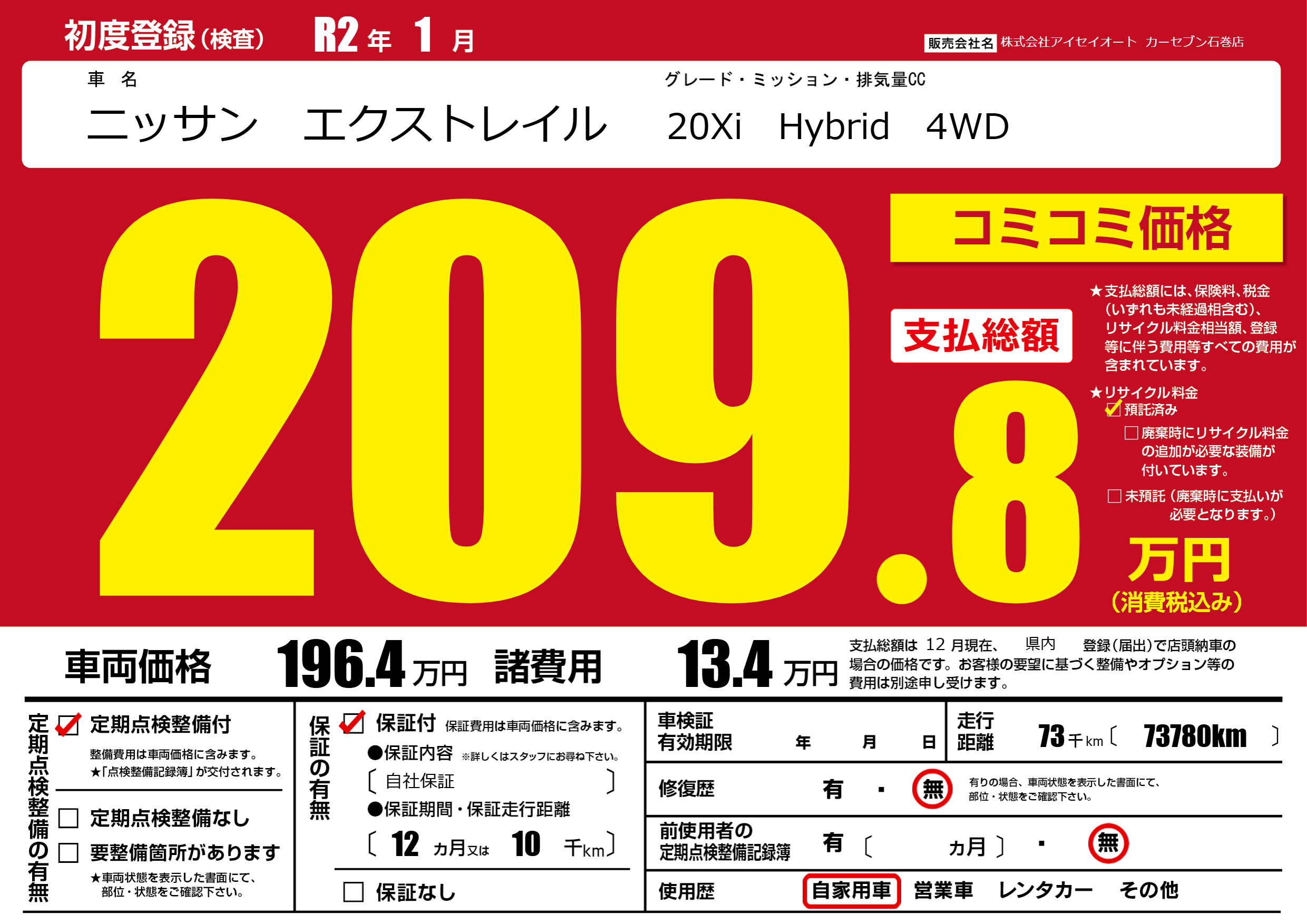 保証付き 保証内容(自社保証) 12ヶ月または(10)千kmまで |
