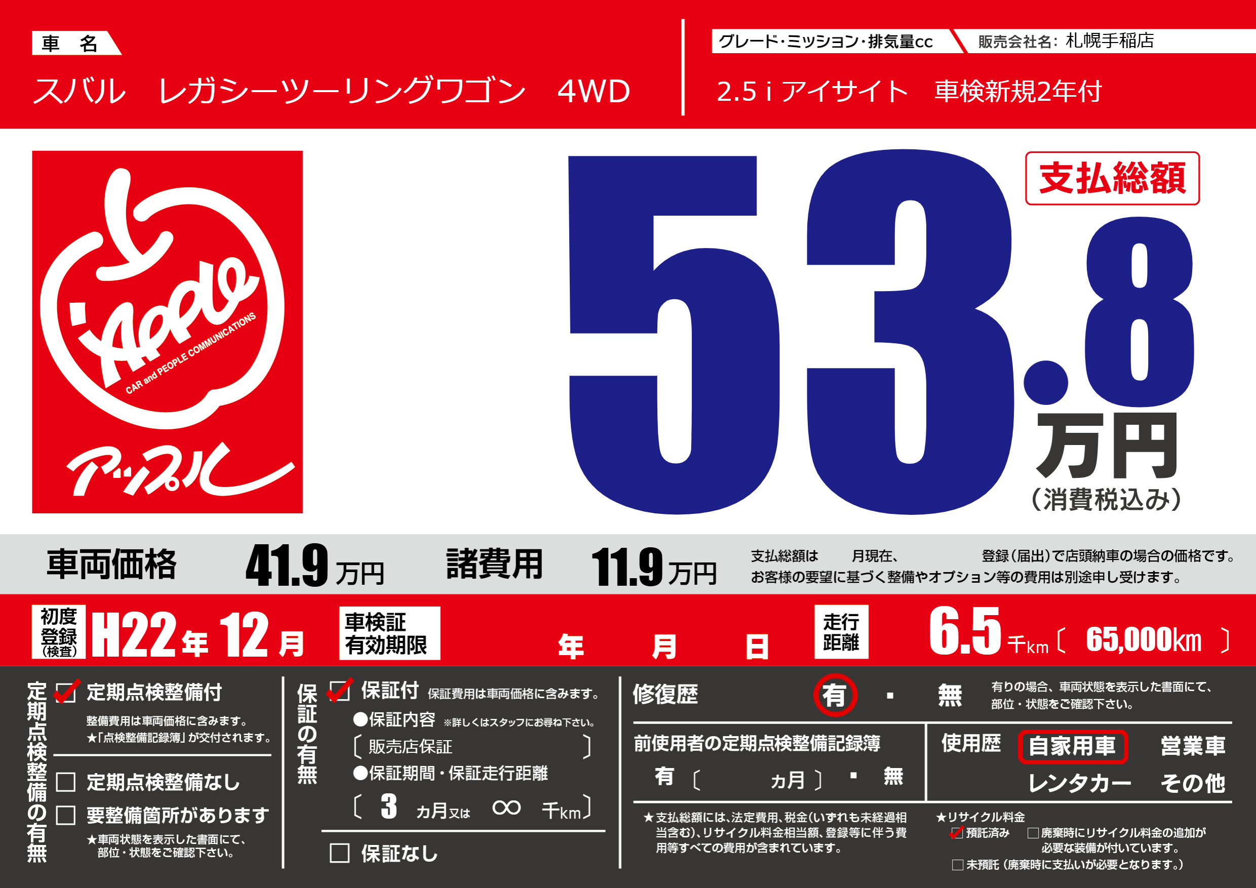 保証付き 保証内容(販売店保証) 3ヶ月または(∞)千kmまで |