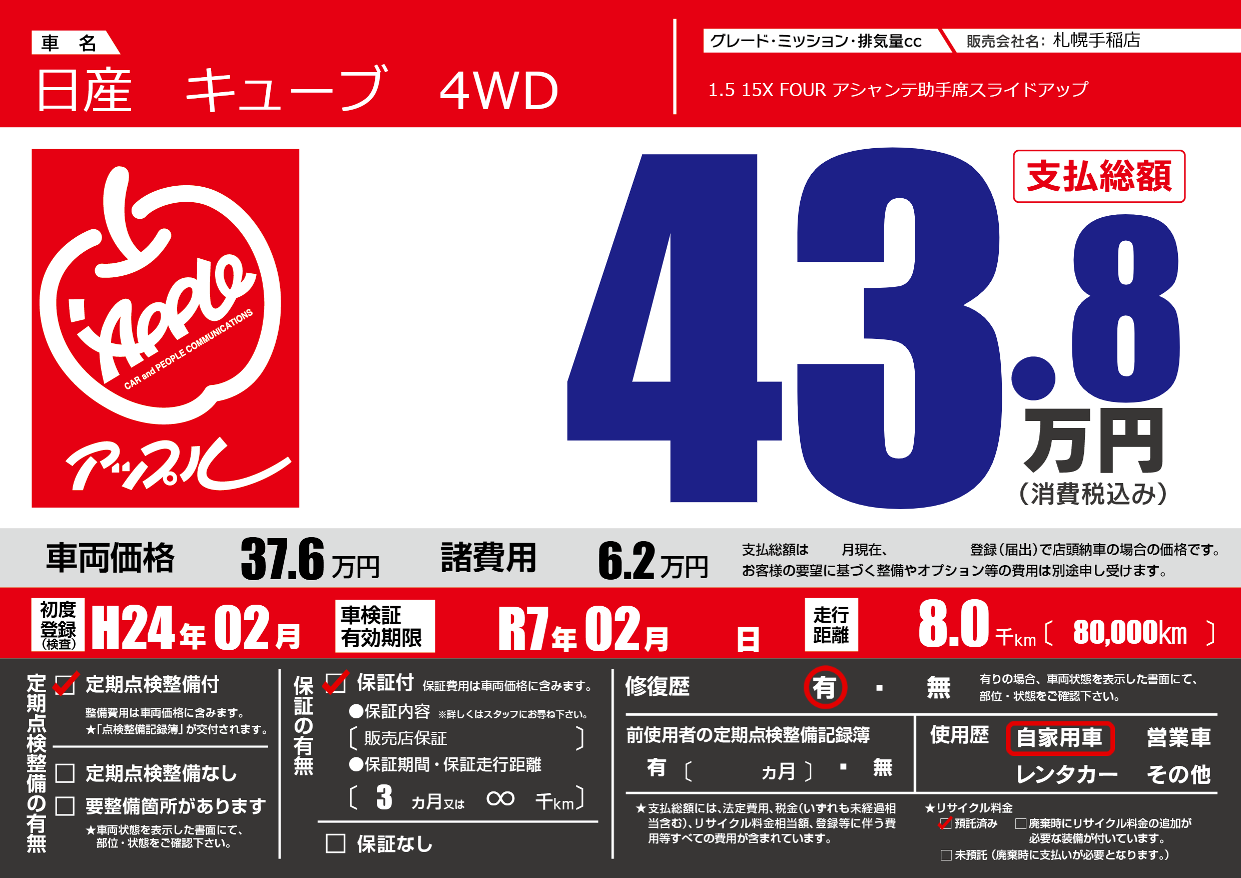 | 車名 | 日産 キューブ 4WD | グレード ミッション 排気量 |