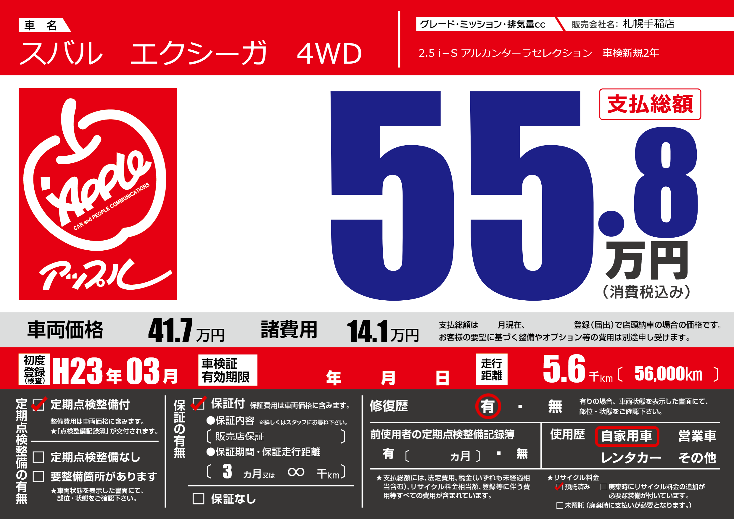 保証付き 保証内容(販売店保証) 3ヶ月または(∞)千kmまで |