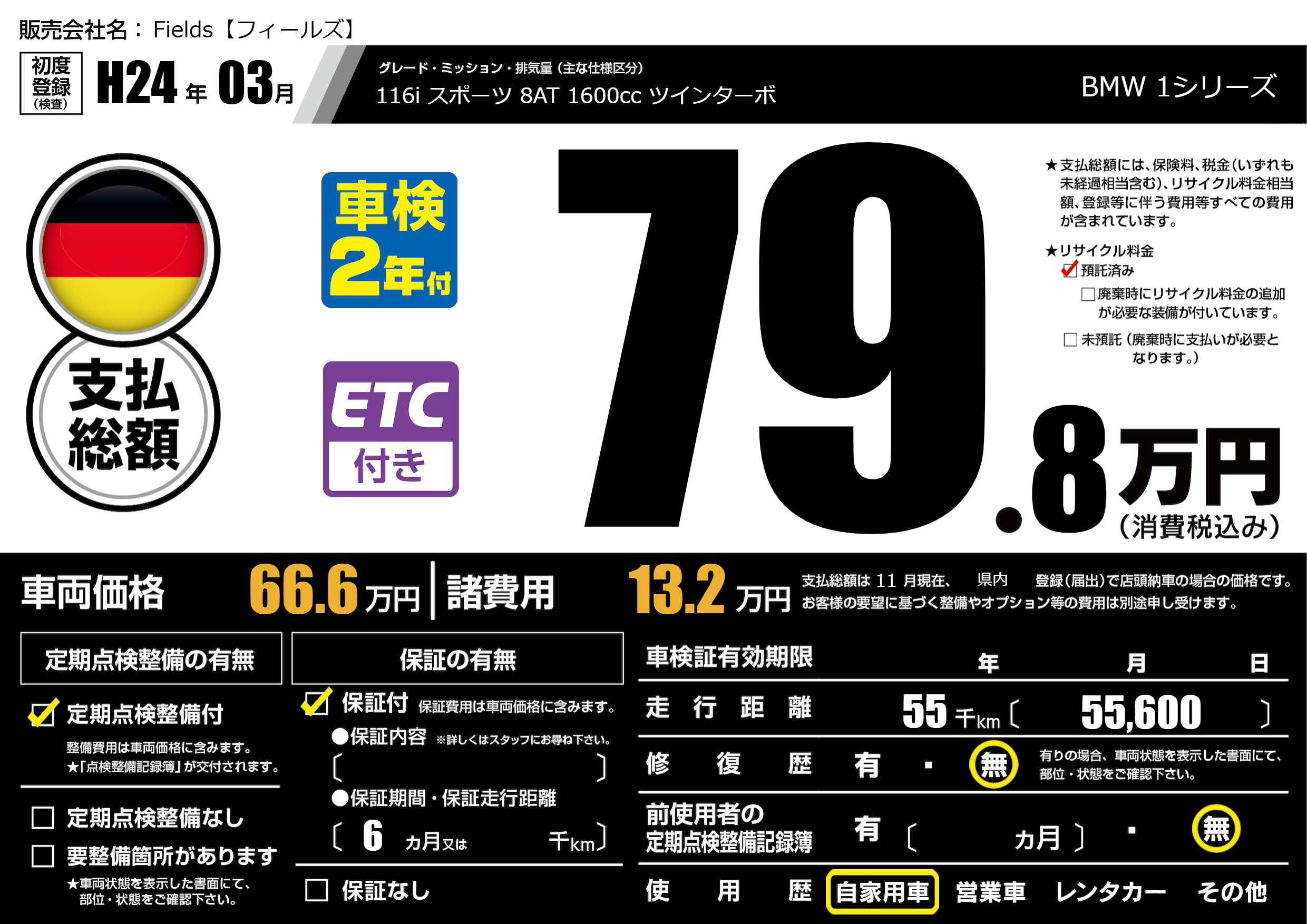 | 車名 | BMW 1シリーズ | グレード ミッション 排気量 |