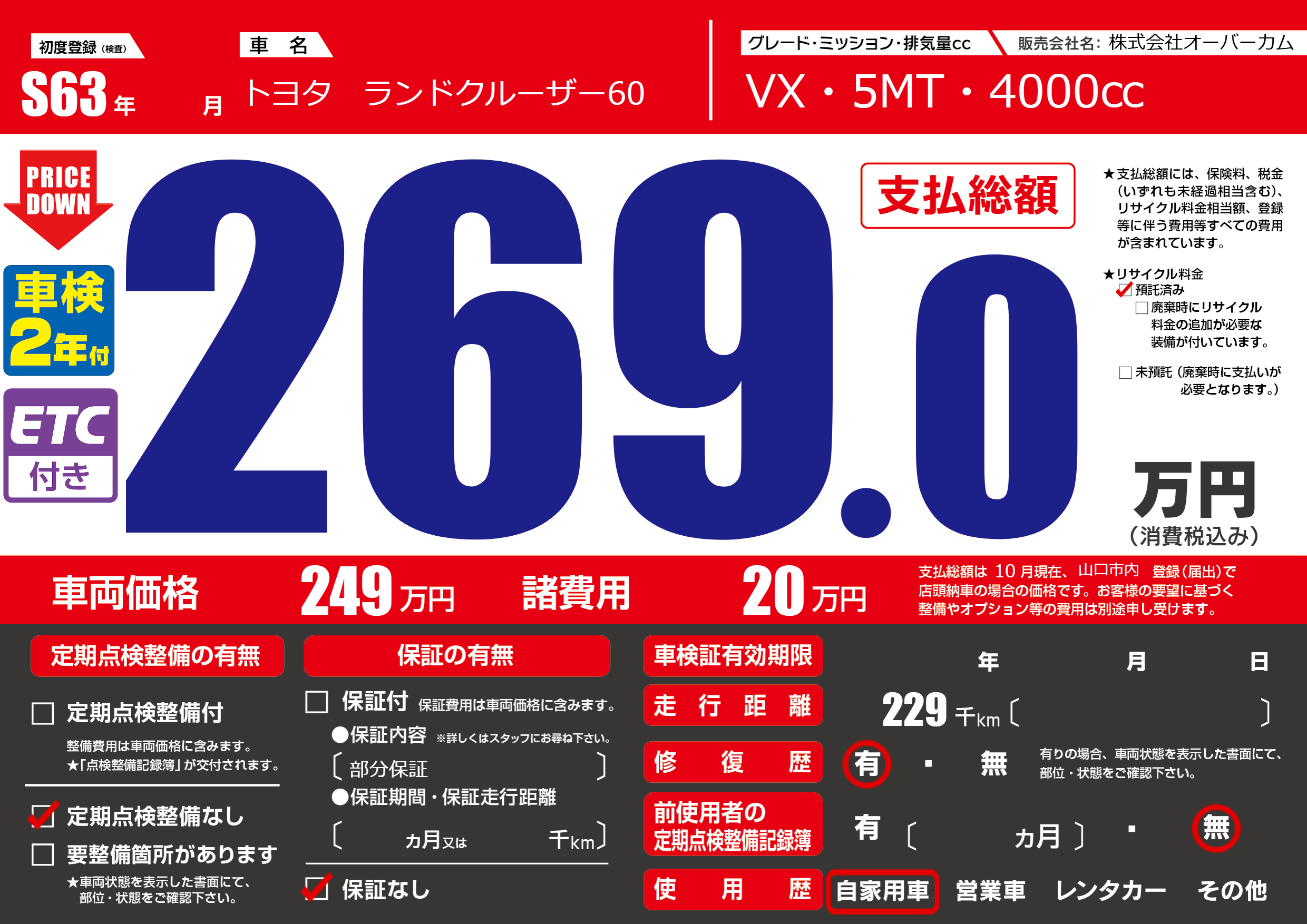 | 車名 | トヨタ ランドクルーザー60 | グレード ミッション 排気量 |