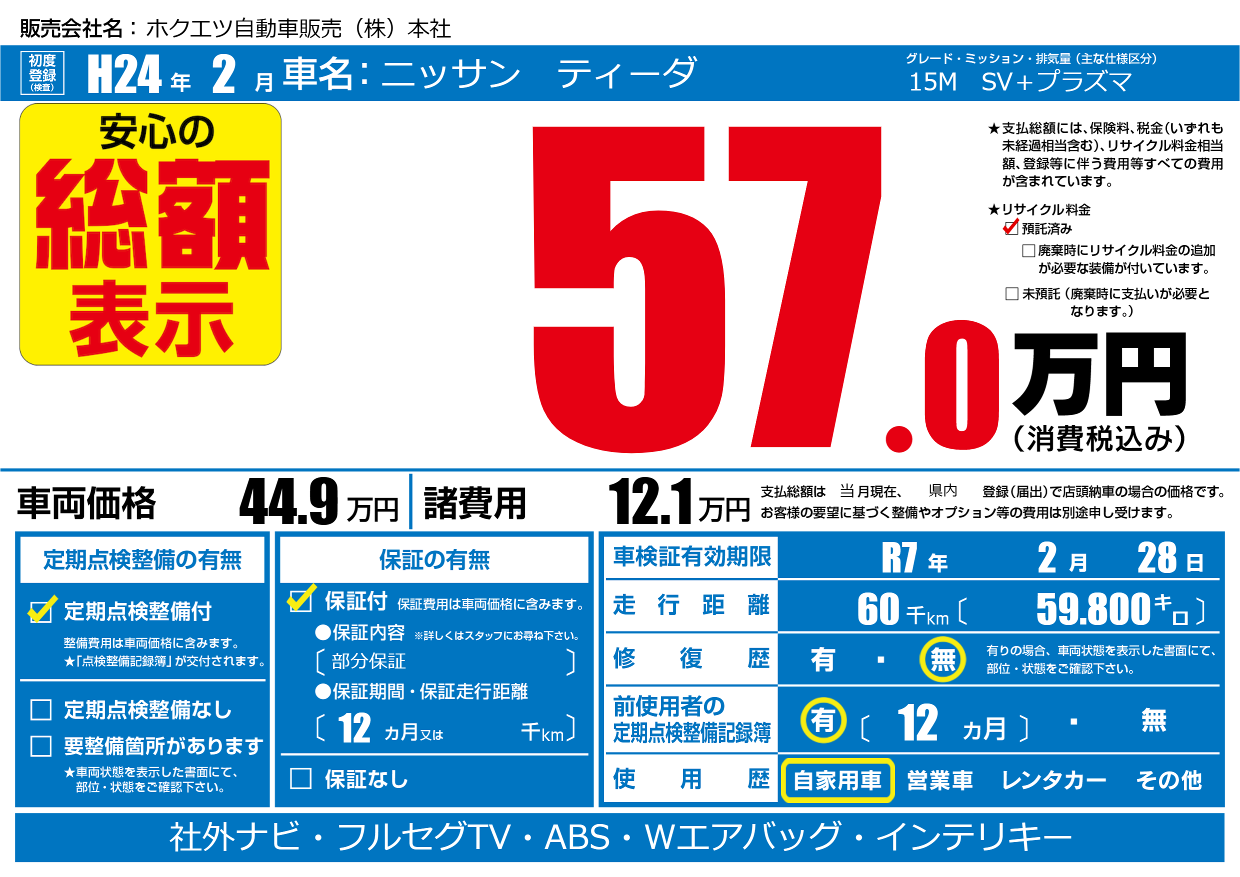| 走行キロ | 6万km | 初年度登録 | H24年2月 |