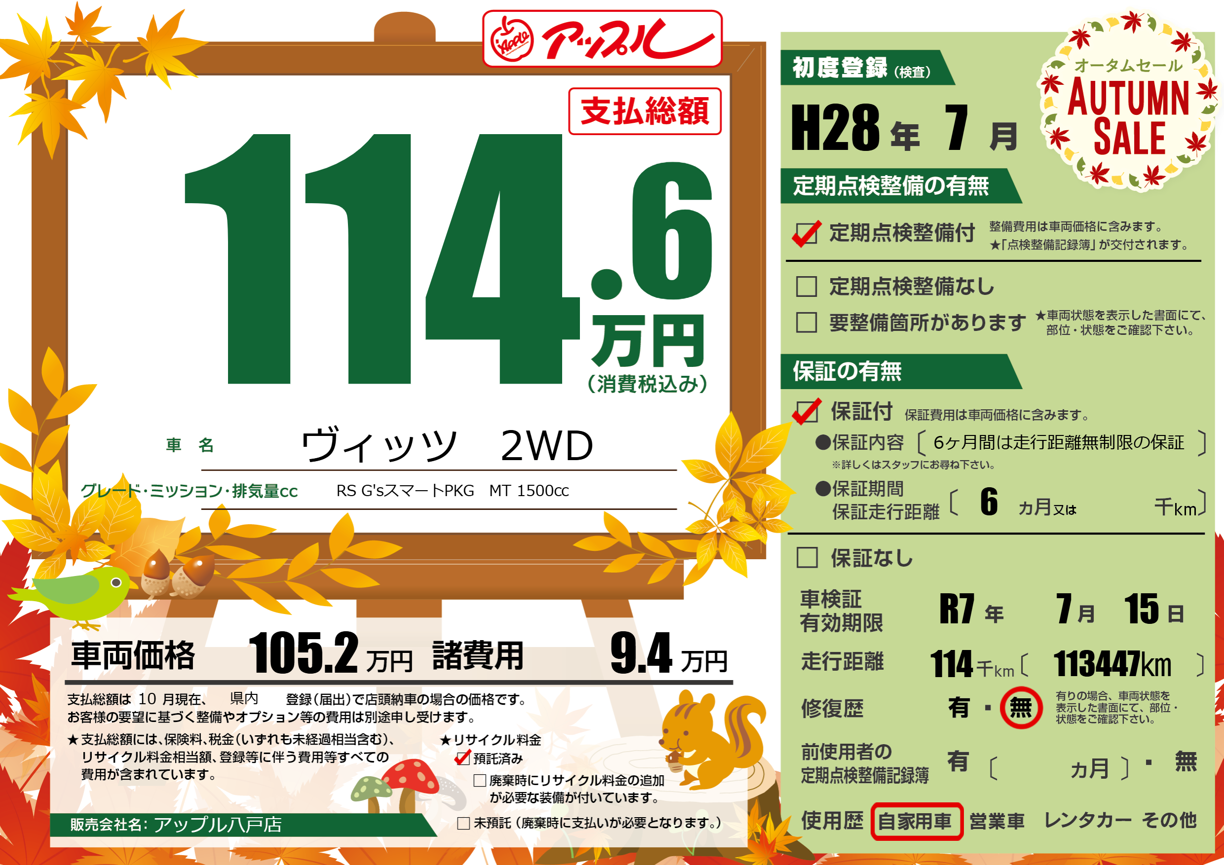 | 走行キロ | 11.4万km | 初年度登録 | H28年7月 |