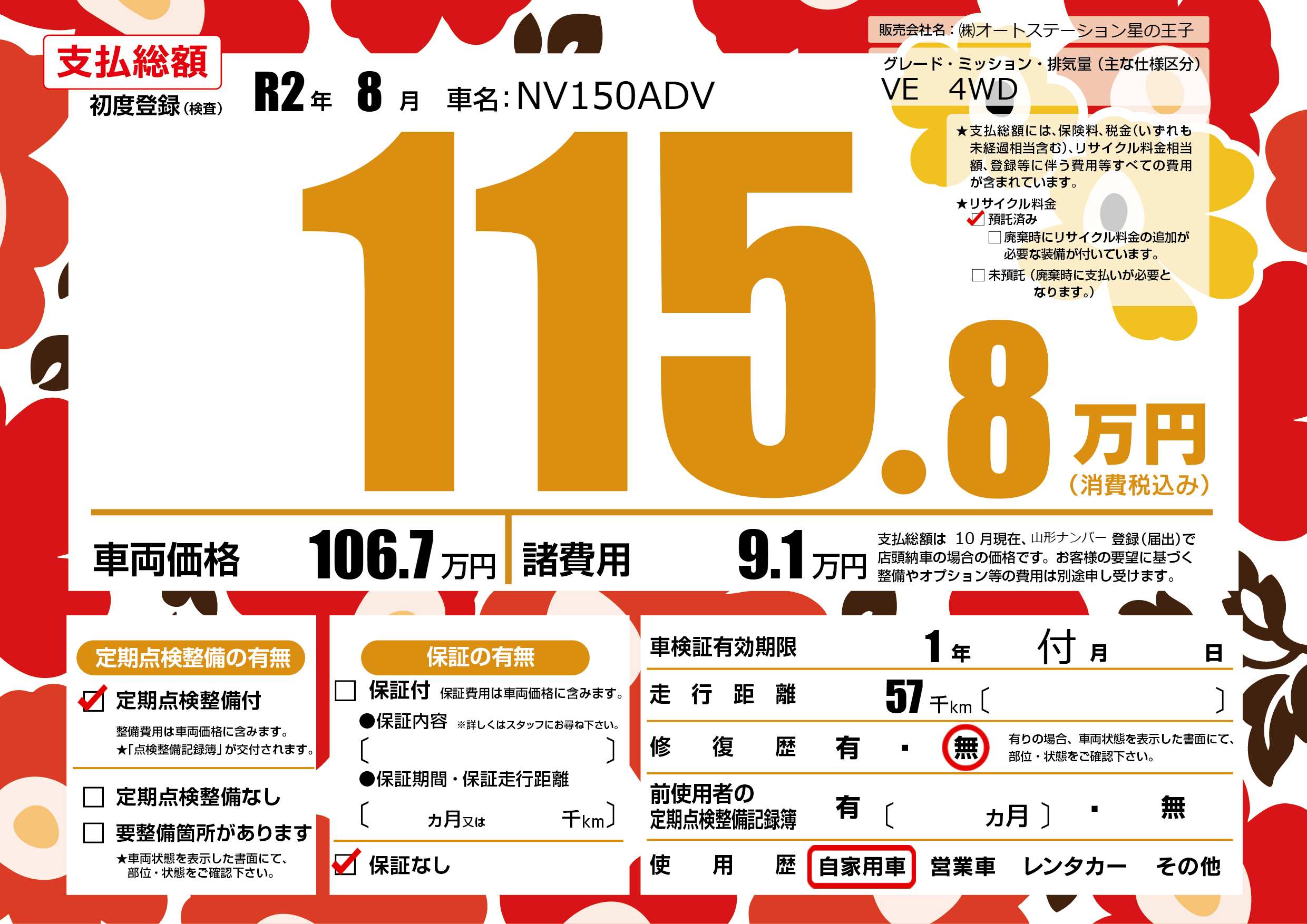 | 走行キロ | 5.7万km | 初年度登録 | R2年8月 |