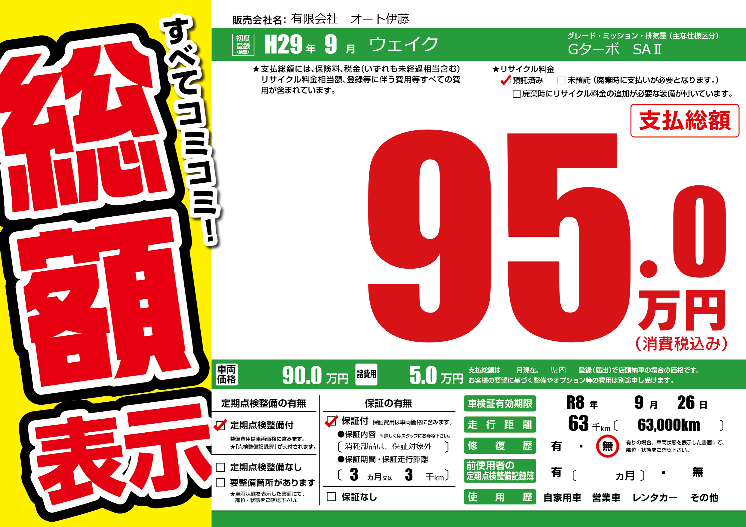保証付き 保証内容(消耗部品は、保証対象外) 3ヶ月または(3)千kmまで |