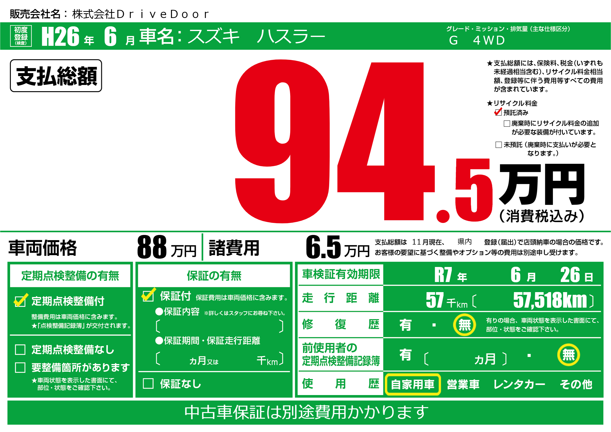 | 車名 | スズキ ハスラー | グレード ミッション 排気量 |