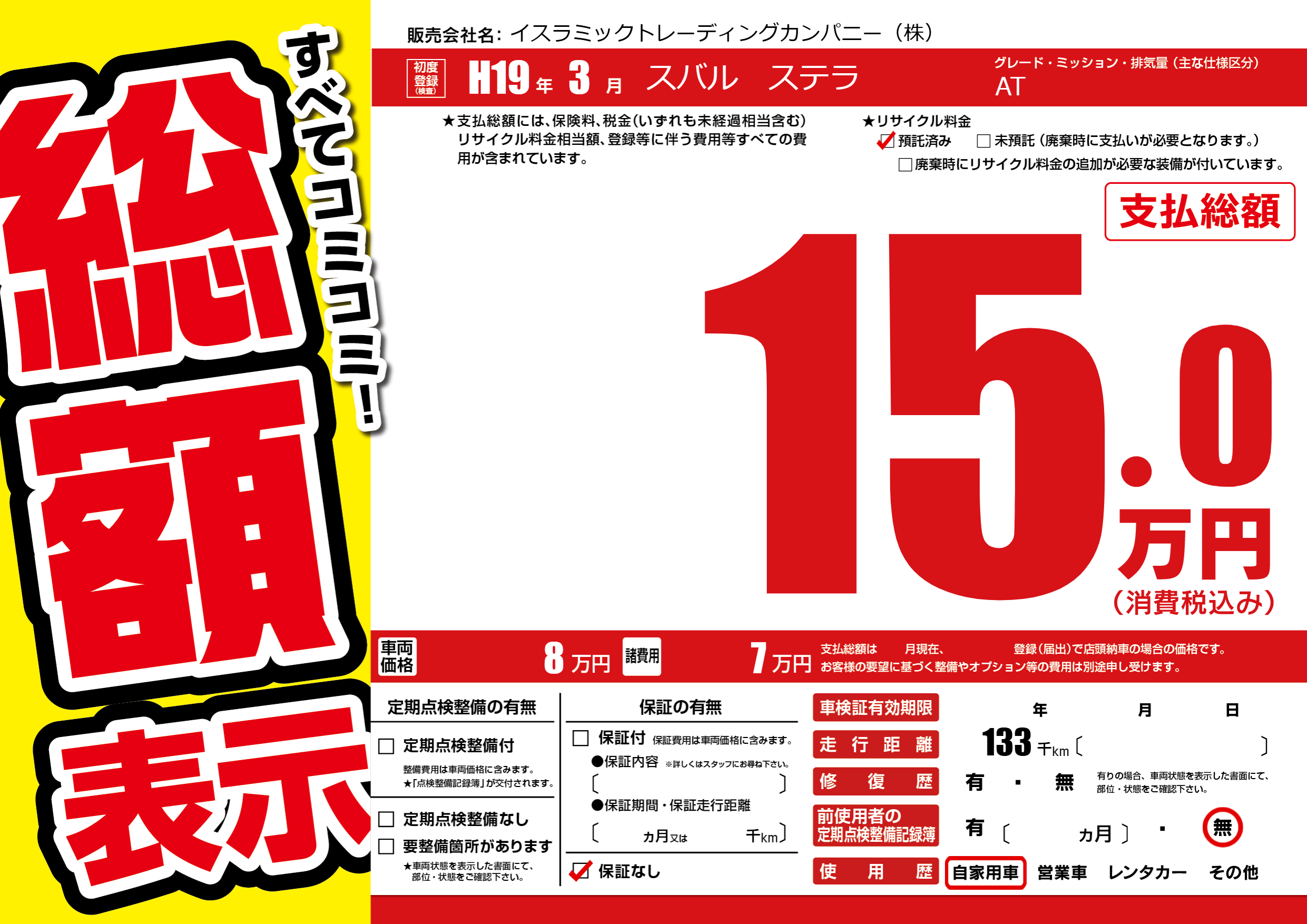 | 走行キロ | 13.3万km | 初年度登録 | H19年3月 |