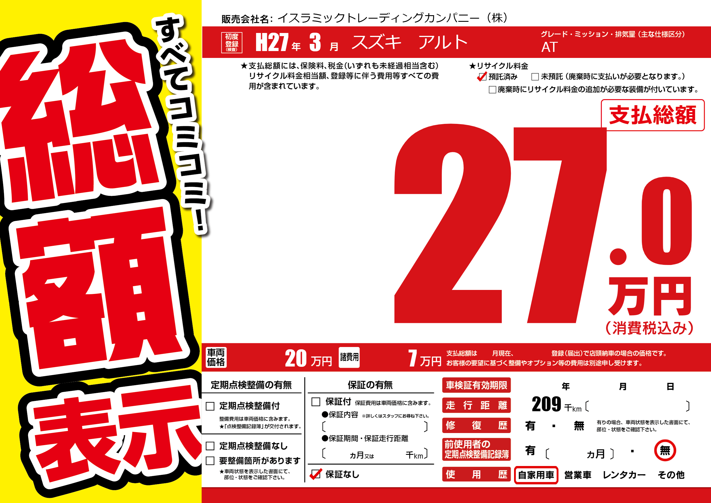 | 走行キロ | 20.9万km | 初年度登録 | H27年3月 |