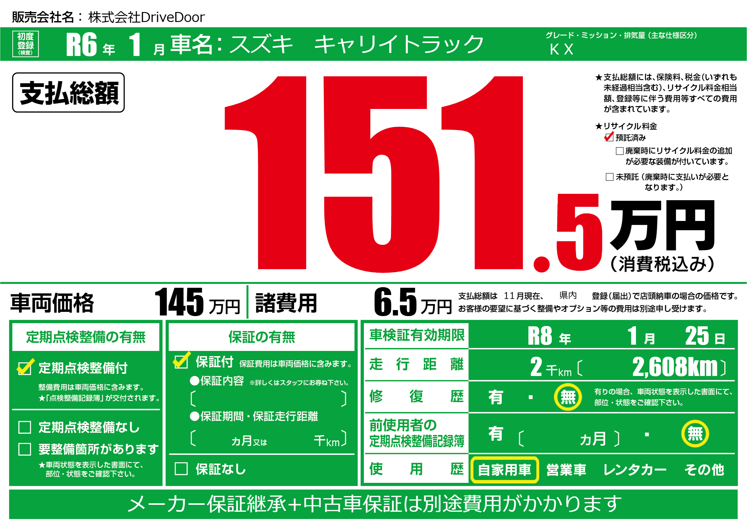 | 走行キロ | 0.2万km | 初年度登録 | R6年1月 |