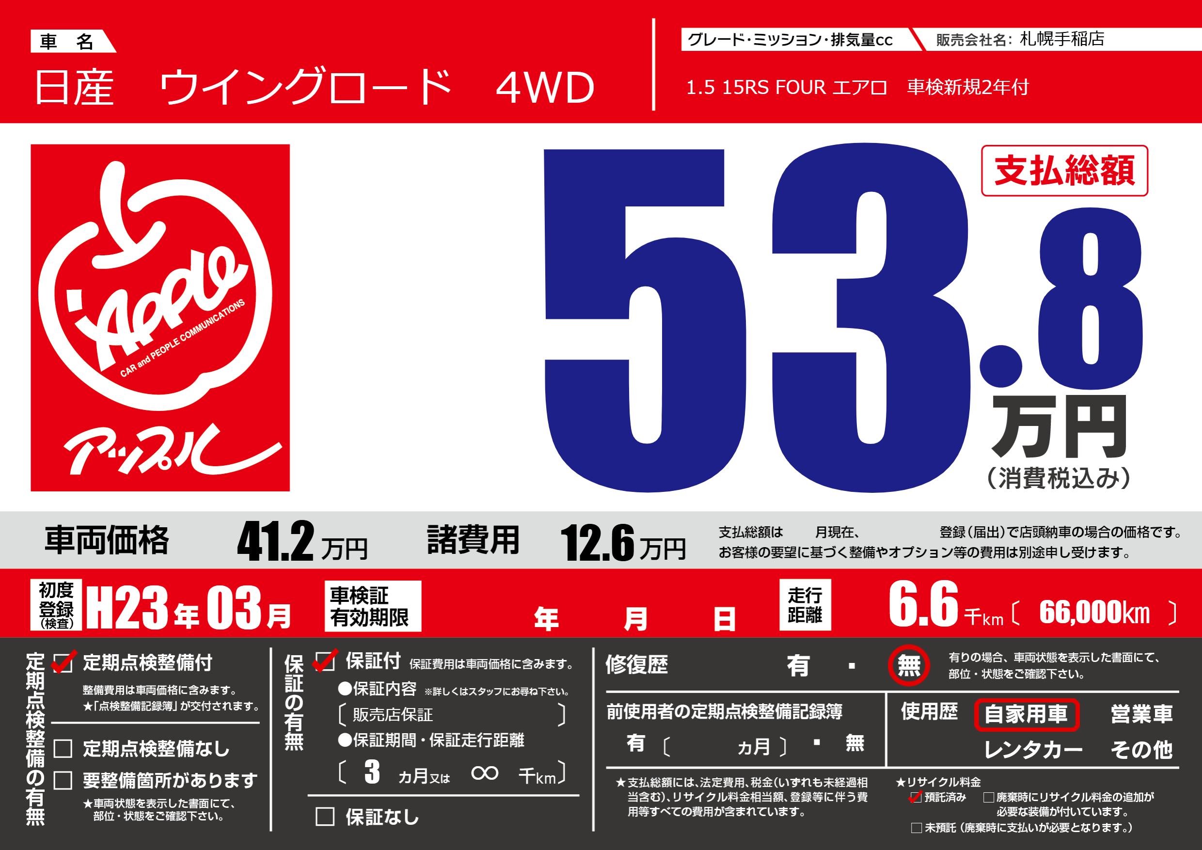 | 車名 | 日産 ウイングロード 4WD | グレード ミッション 排気量 |