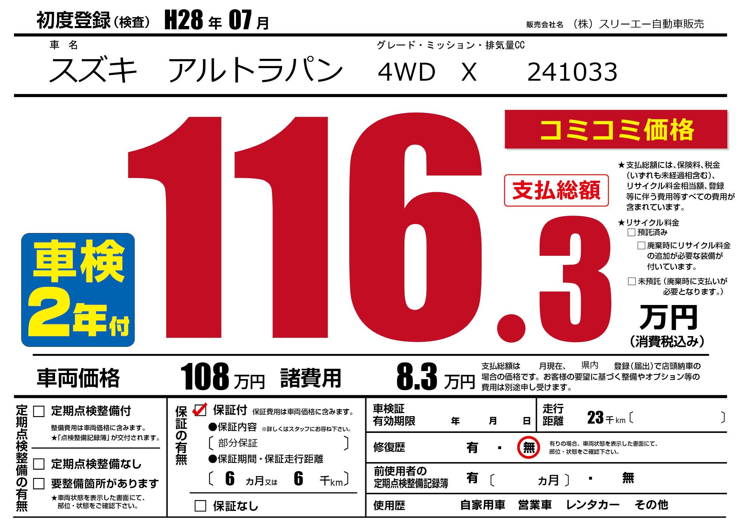 保証付き 保証内容(部分保証) 6ヶ月または(6)千kmまで |