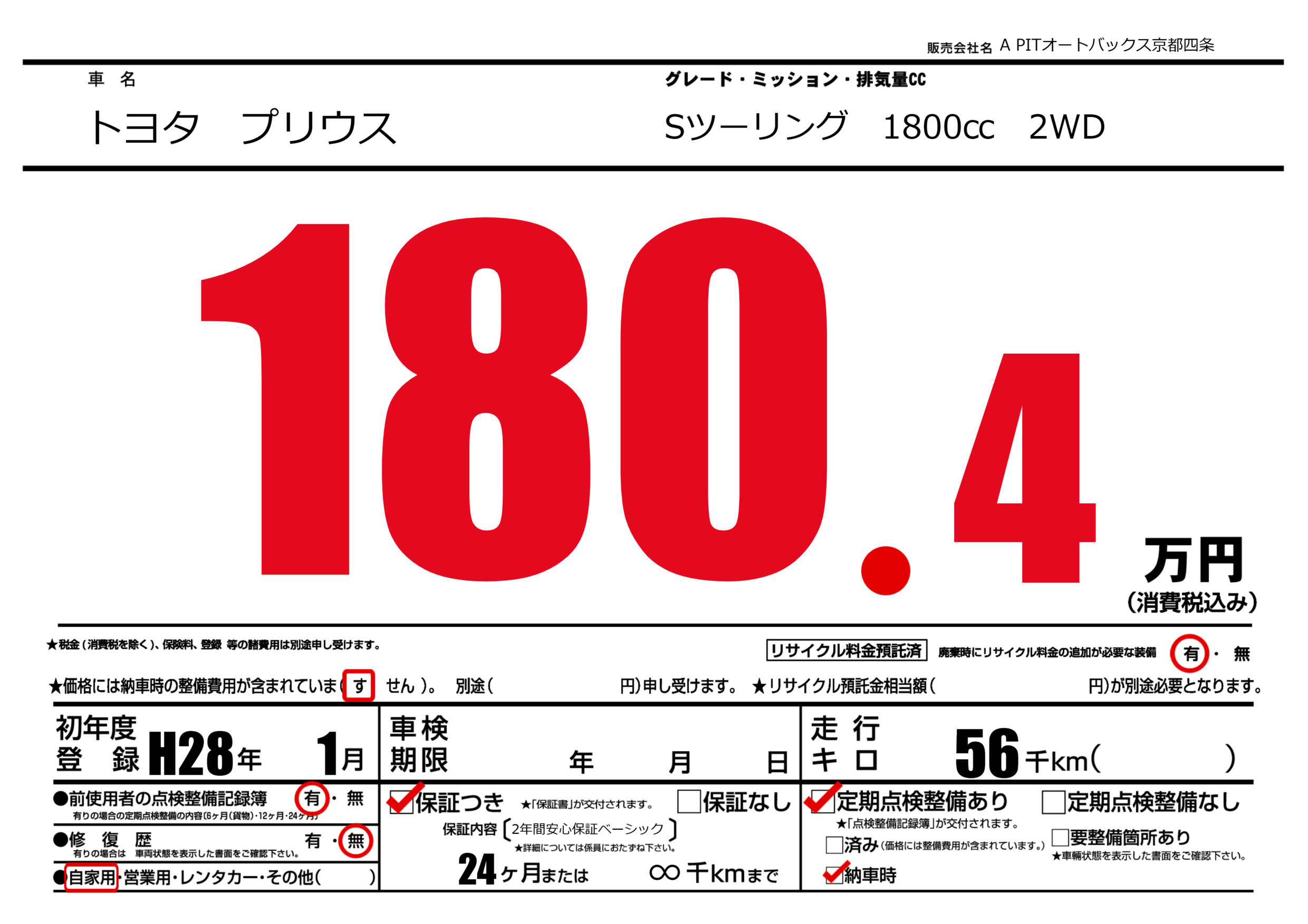 保証なし 保証内容(2年間安心保証ベーシック) 24ヶ月または(∞)千kmまで |