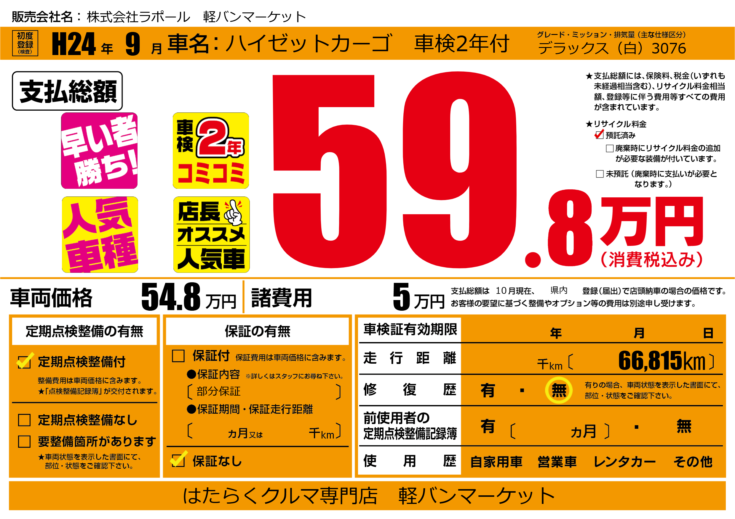 | 車名 | ハイゼットカーゴ 車検2年付 | グレード ミッション 排気量 |