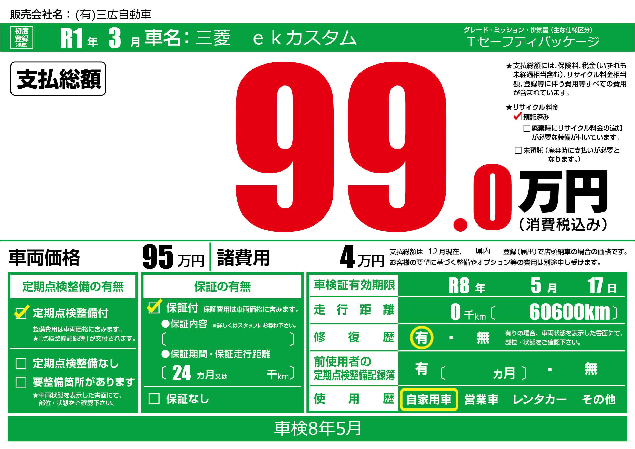 | 車名 | 三菱 ekカスタム | グレード ミッション 排気量 |