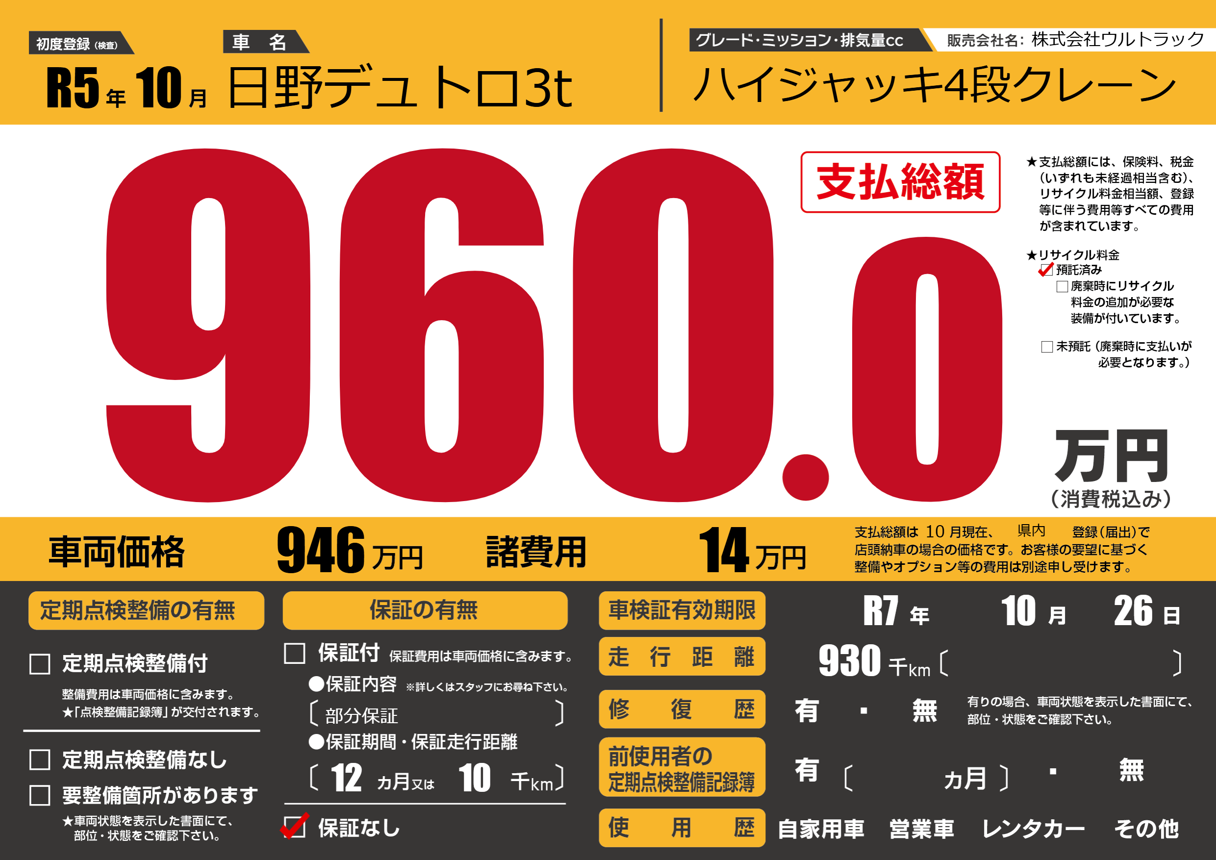 | 走行キロ | 93万km | 初年度登録 | R5年10月 |