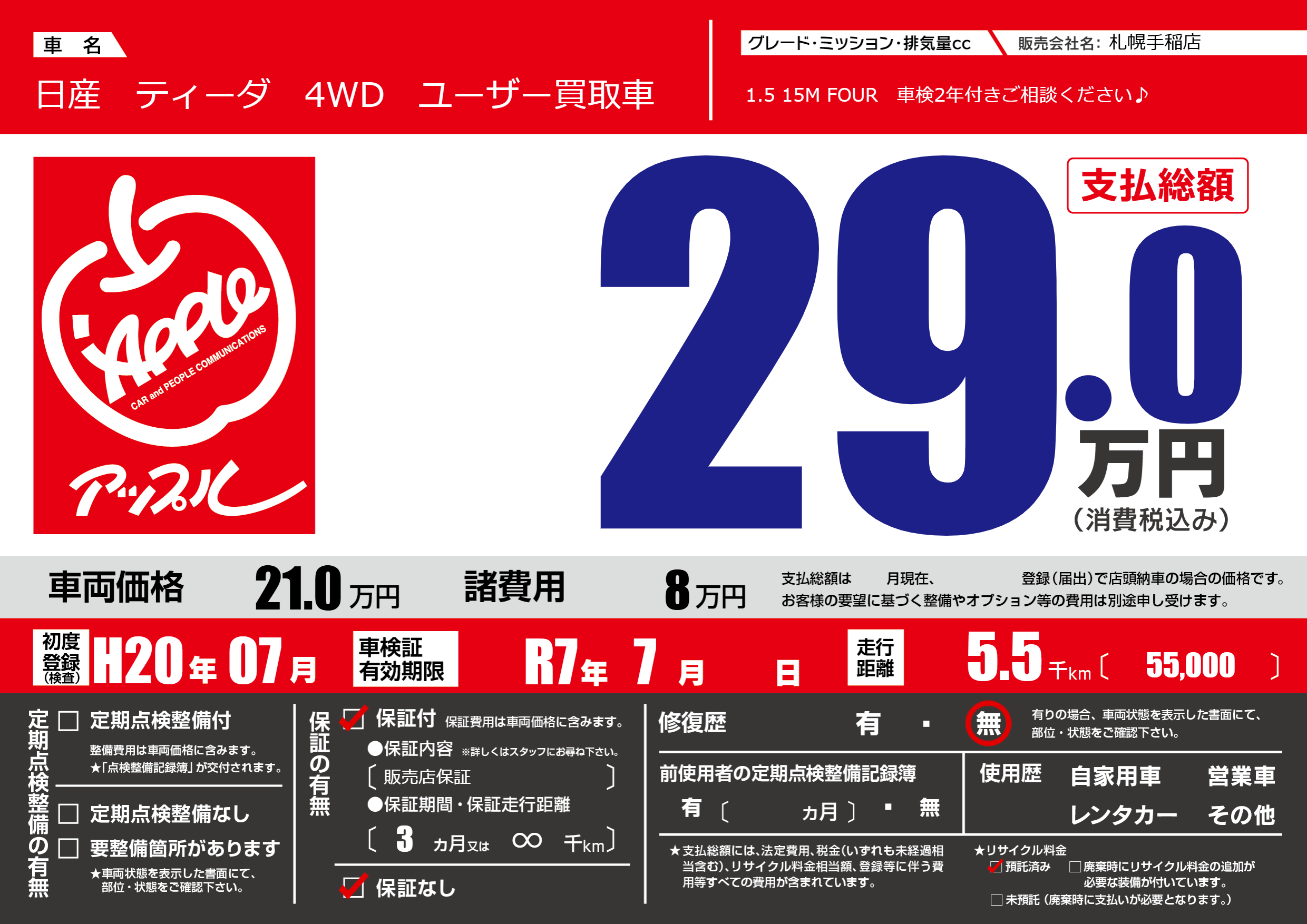 | 車名 | 日産 ティーダ 4WD ユーザー買取車 | グレード ミッション 排気量 |