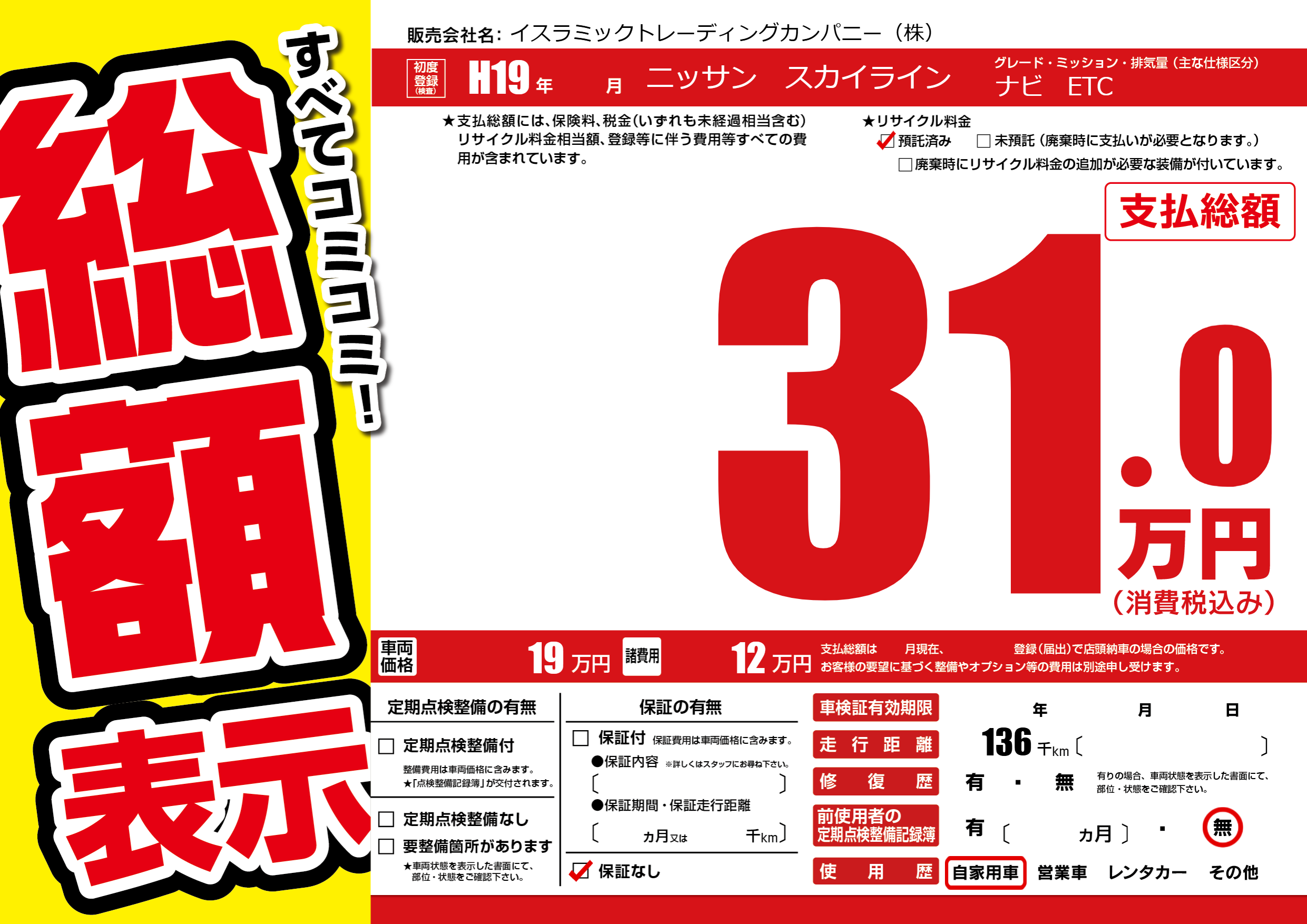 | 車名 | ニッサン スカイライン | グレード ミッション 排気量 |