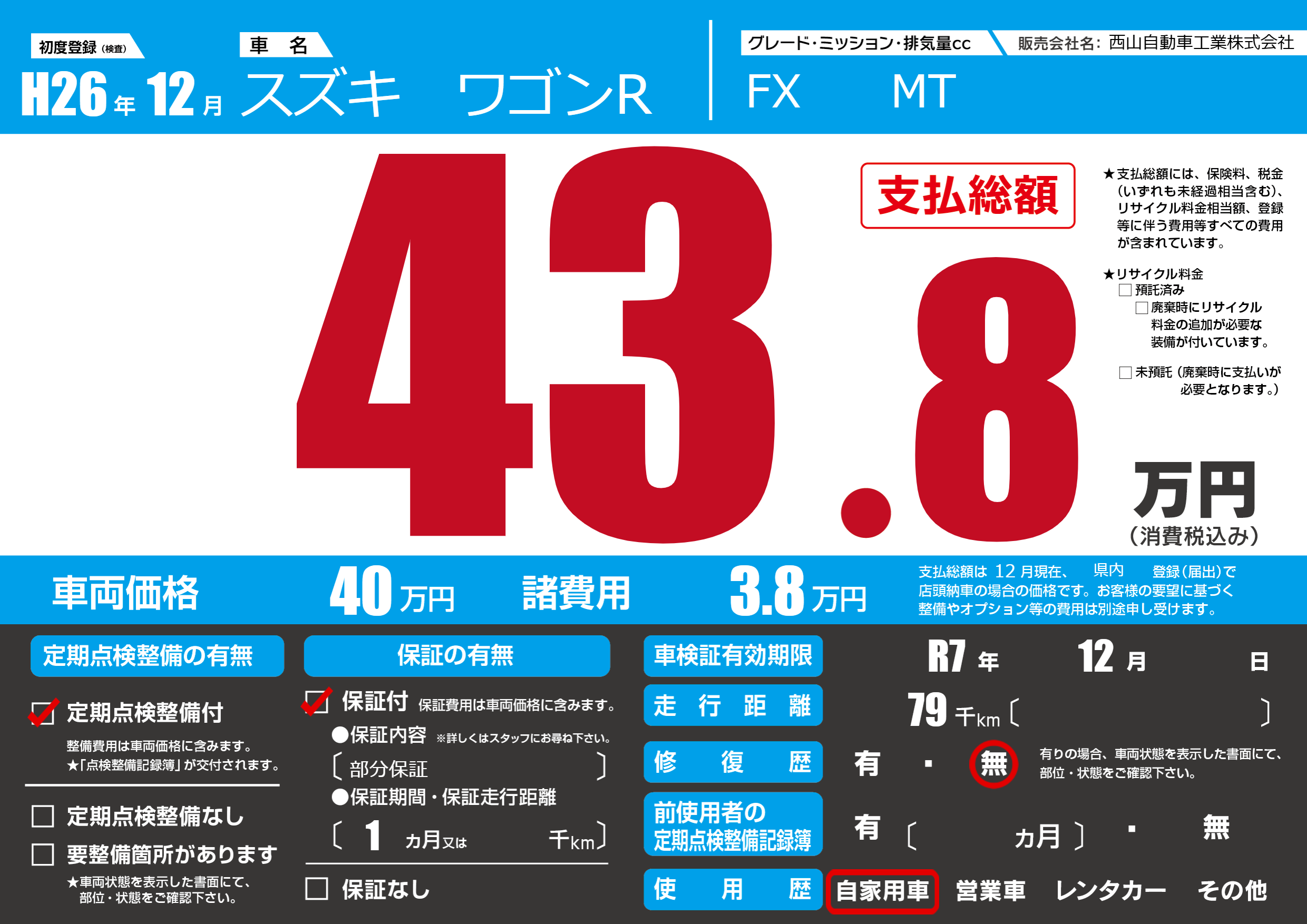 | 車名 | スズキ ワゴンR | グレード ミッション 排気量 |
