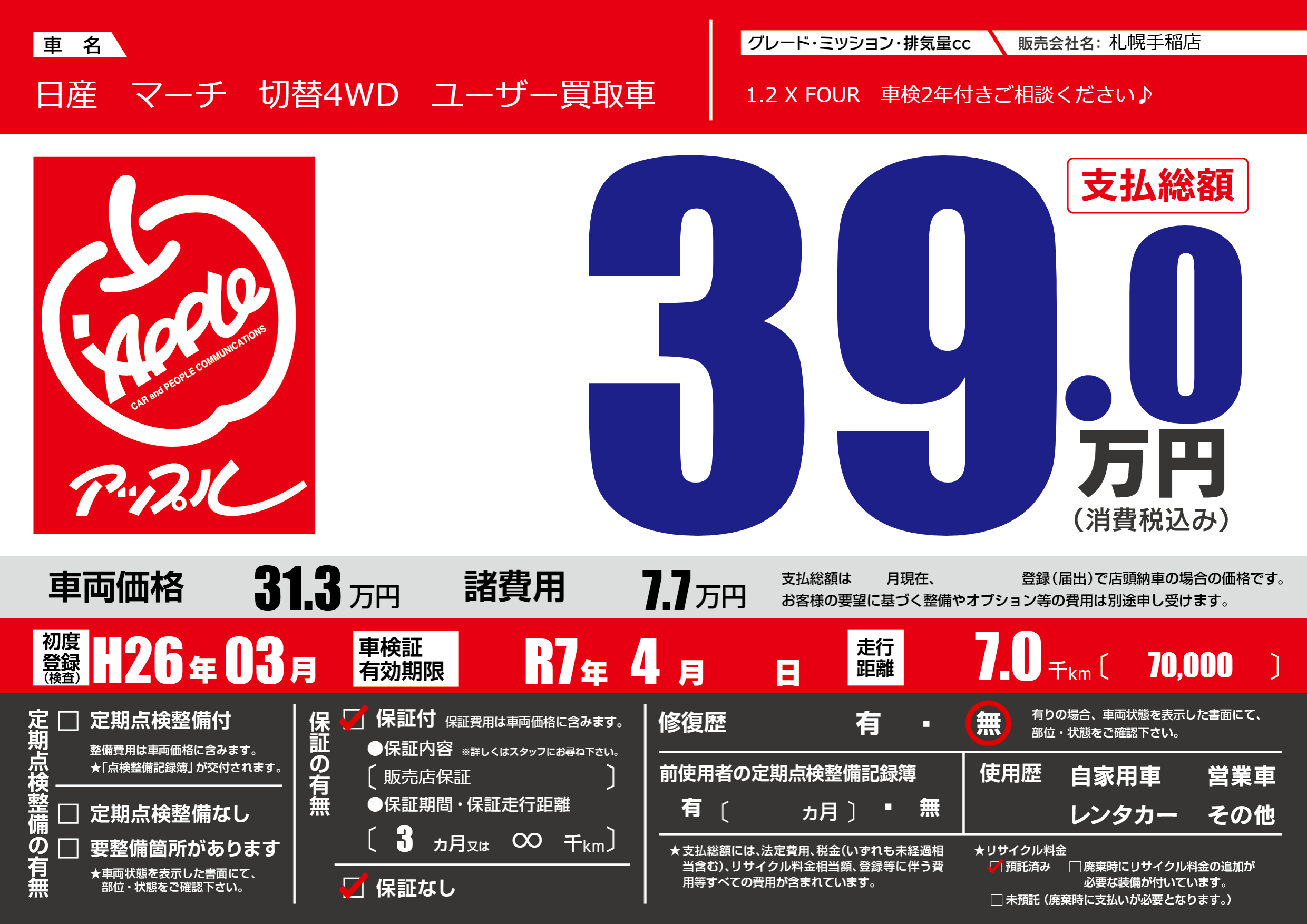 | 車名 | 日産 マーチ 切替4WD ユーザー買取車 | グレード ミッション 排気量 |