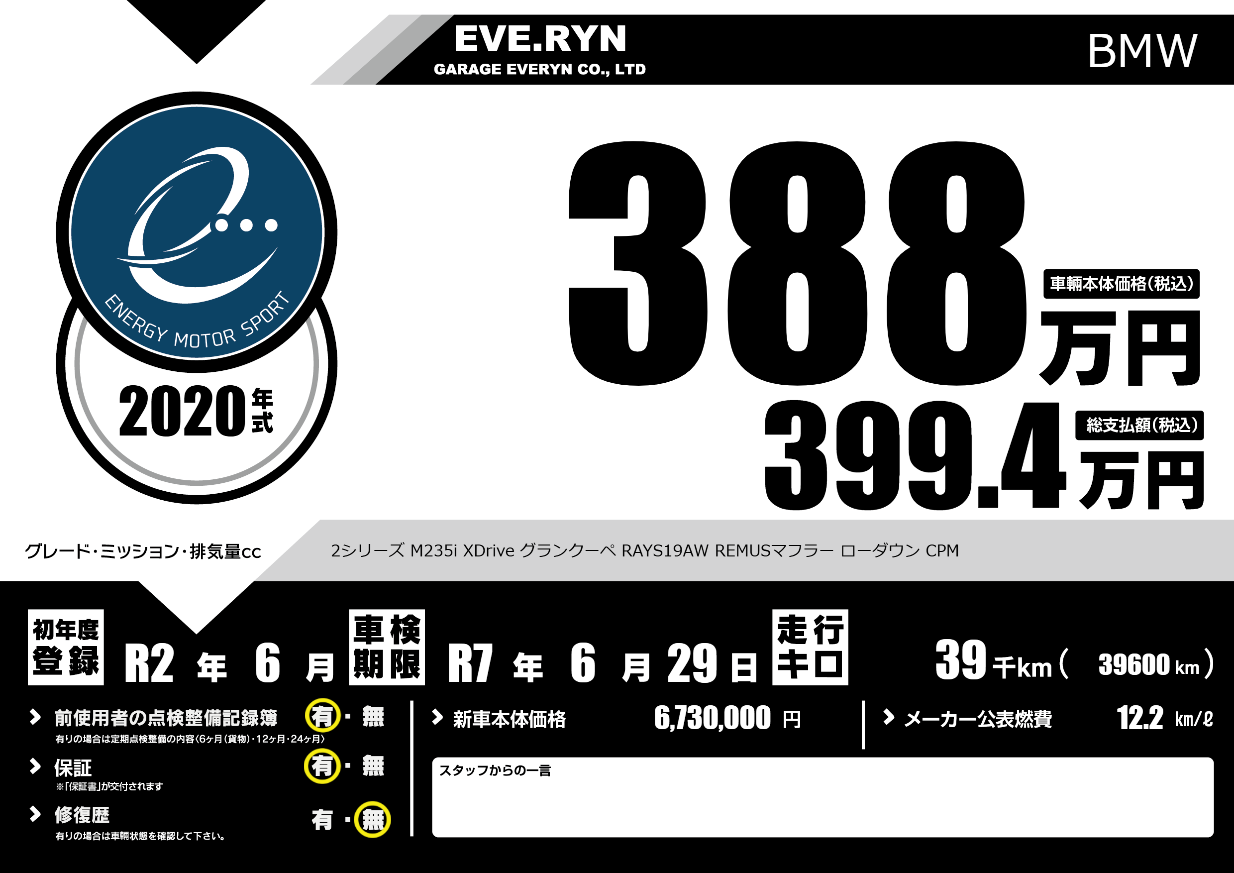 2シリーズ M235i XDrive グランクーペ RAYS19AW REMUSマフラー ローダウン CPM |