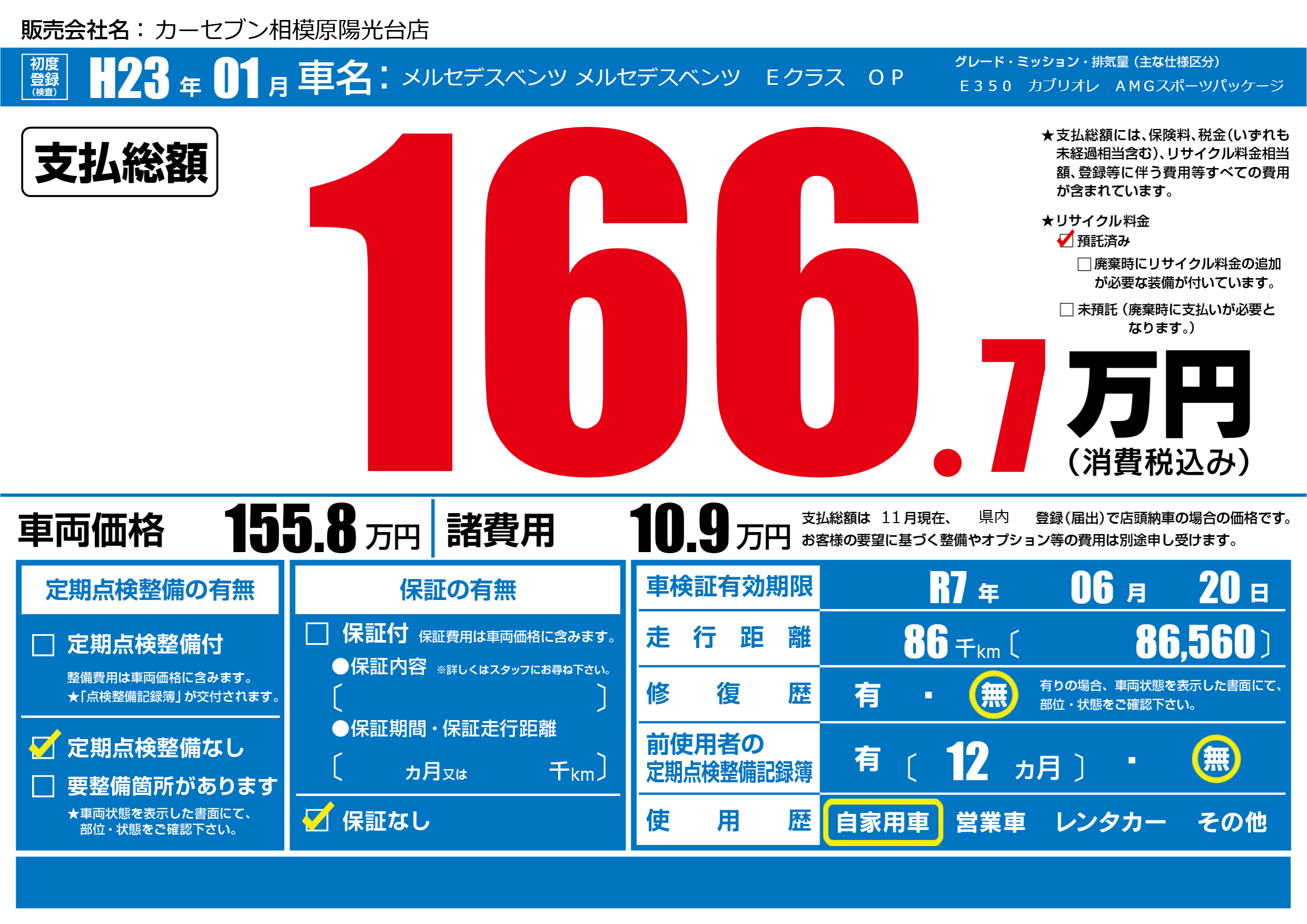 | 車名 | メルセデスベンツ メルセデスベンツ Eクラス OP | グレード ミッション 排気量 |